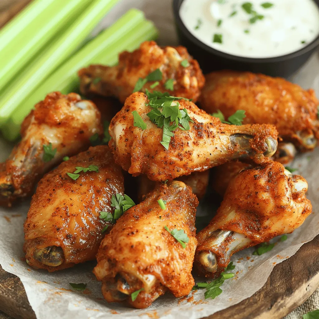 After cooking, take the wings out and let them rest for a few minutes. For a nice touch, sprinkle fresh chopped parsley on top. Serve them on a platter lined with parchment. Add a side of ranch or blue cheese dressing for dipping. You can also include celery sticks for crunch.