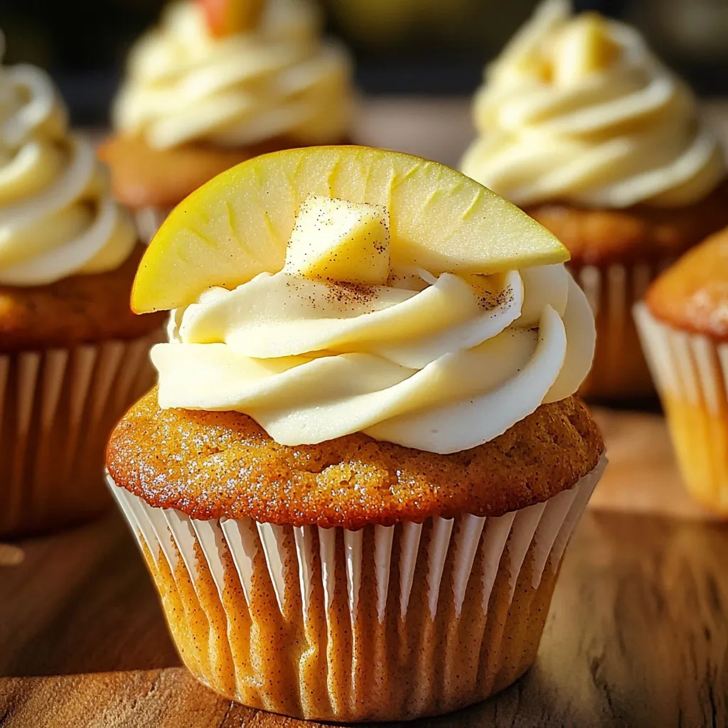 After baking, take the cupcakes out of the oven. Let them sit in the pan for about 5 minutes. Then, move them to a wire rack to cool completely. Once cool, top each cupcake with cream cheese frosting. A sprinkle of cinnamon makes a lovely touch. For a final flourish, add a thin slice of apple on top. Enjoy your delicious fall treats!