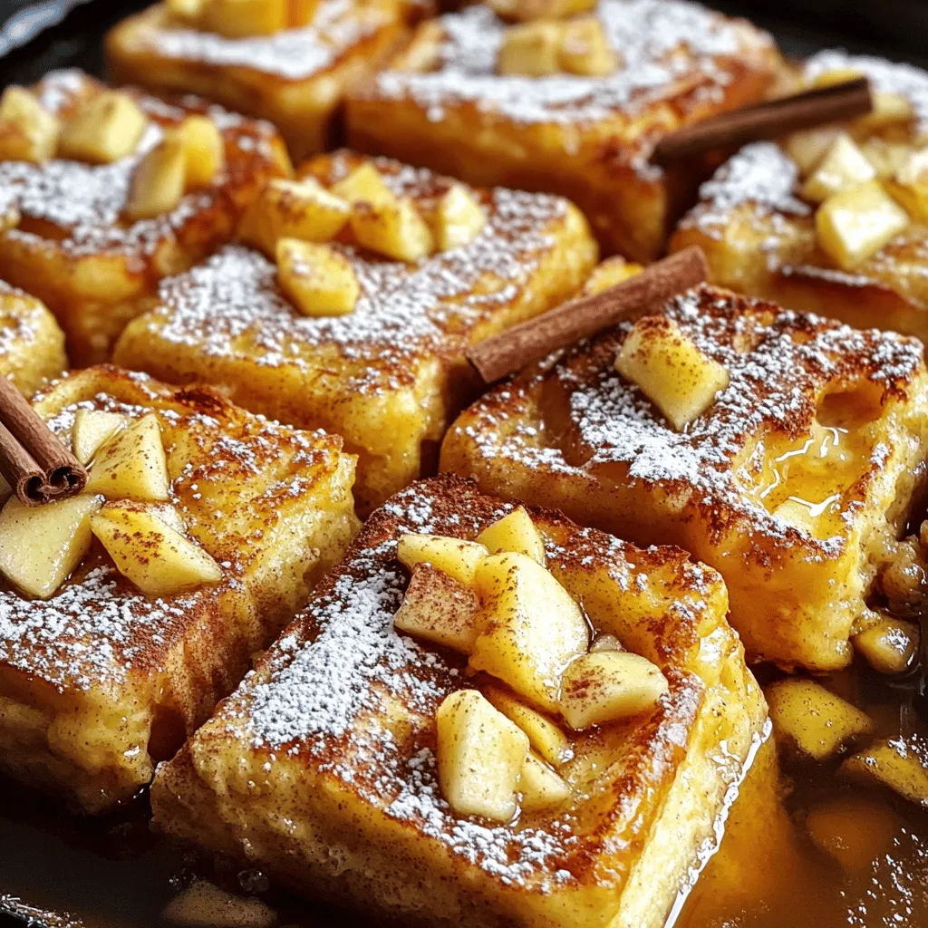 - 8 slices of thick bread (challah or brioche) - 3 medium apples, peeled, cored, and diced - 4 large eggs - 2 cups milk - 1/4 cup brown sugar - 1 teaspoon vanilla extract - 1 teaspoon ground cinnamon - 1/4 teaspoon nutmeg - 1/4 cup chopped walnuts - Maple syrup, for serving Gathering the right ingredients makes all the difference. For this Apple Cinnamon French Toast Bake, choose thick slices of challah or brioche. These types of bread soak up the egg mixture well, giving you a soft and fluffy bake. You need three apples, too. I prefer a mix of sweet and tart apples, like Honeycrisp and Granny Smith. The sweetness from the brown sugar and cinnamon will balance the tartness perfectly. Next, grab four large eggs and two cups of milk. These are the base for your custard. They create a rich, creamy texture. For flavor, brown sugar, vanilla extract, ground cinnamon, and nutmeg are essential. These spices bring warmth and depth to your dish. You can adjust them based on your taste. If you like some crunch, add walnuts. They lend a nice texture. Serve your bake with maple syrup for that classic touch. Enjoy! - Preheat your oven to 350°F (175°C) and grease a 9x13-inch baking dish with butter. - Cut 8 slices of thick bread into cubes. Place half of the cubes in the dish. - In a medium bowl, mix 3 diced apples with 1 tablespoon of brown sugar and 1/2 teaspoon of cinnamon. - Layer this apple mixture over the bread cubes in the baking dish. - In a large bowl, whisk together 4 eggs, 2 cups of milk, 1/4 cup of brown sugar, 1 teaspoon of vanilla, 1 teaspoon of cinnamon, and 1/4 teaspoon of nutmeg. - Pour this egg mixture over the layered bread and apples. Press down gently to soak the bread. - If you like, sprinkle 1/4 cup of chopped walnuts on top. - Cover the dish with foil and let it sit for about 15 minutes. - Remove the foil and bake for 35-40 minutes, until the top is golden brown. - Let it cool for a few minutes before slicing. Serve warm with maple syrup drizzled on top. Soaking the bread well is key for a great texture. You want every piece to soak up the egg mixture. This helps create a soft center while the top gets a nice crunch. Aim for at least 15 minutes of soaking. Bake at 350°F (175°C) for 35-40 minutes. Keep an eye on it towards the end. You want a golden top and a slight jiggle in the center. This means it’s perfectly cooked. You can adjust the spices to match your taste. If you love cinnamon, add more! You might also try a pinch of ginger or allspice for a twist. To balance sweetness, choose tart apples like Granny Smith. They add a nice contrast to the sweet egg mixture. Mixing sweet and tart apples can create a rich flavor. For serving, use a large platter to show off your bake. Dust with powdered sugar for a sweet touch. Garnish with extra apple slices and a few cinnamon sticks. This adds color and makes your dish look inviting. A drizzle of maple syrup on top is a must for serving. {{image_2}} You can change the bread to make this dish even better. Sourdough or whole grain bread adds a nice texture. They soak up the egg mixture well. If you need gluten-free options, use gluten-free bread. Many brands taste great and work just as well in this recipe. You can mix in other fruits too. Berries like strawberries or blueberries add a pop of color and flavor. Sliced bananas also work well and make it sweeter. For some crunch, try using different nuts. Almonds or pecans can replace walnuts for a new twist. You can create fun twists for the holidays. Add cranberries for a festive touch in winter. In fall, try using pumpkin spice instead of cinnamon. Seasonal spices like ginger and allspice can give this dish a warm flavor. To store leftovers, let the dish cool first. Place any remaining French toast bake in an airtight container. Store it in the refrigerator for up to three days. When you want to enjoy it again, simply reheat it. You can use the microwave or the oven. If using the microwave, heat individual portions for one to two minutes. If using the oven, preheat it to 350°F (175°C) and warm for about 10-15 minutes. For long-term storage, you can freeze the French toast bake. Cut it into squares and wrap each piece tightly in plastic wrap. Place the wrapped pieces in a freezer-safe bag or container. They will stay fresh for up to three months. When you’re ready to eat, thaw the pieces in the refrigerator overnight. To reheat, follow the same steps as for short-term storage. Enjoy your delicious breakfast anytime! Yes, you can prepare this dish the night before. Just follow these steps: - Assemble the French toast bake in the baking dish. - Cover it tightly with plastic wrap or foil. - Place it in the fridge overnight. This helps the bread soak up the egg mixture. In the morning, just bake it straight from the fridge. To make this dish dairy-free, you can swap out the milk and eggs. Use these easy substitutions: - Replace milk with almond milk, oat milk, or coconut milk. - For eggs, use 1/4 cup of unsweetened applesauce for each egg. These changes keep the flavor while making it suitable for dairy-free diets. For the best taste, use a mix of sweet and tart apples. Here are my top picks: - Honeycrisp apples for sweetness. - Granny Smith apples for tartness. These apples balance each other well, giving your French toast bake a full flavor. This recipe is simple and full of flavor. You learned about essential ingredients like thick bread, apples, and eggs. Adding spices and optional toppings sets it apart. Following the step-by-step instructions ensures you create a tasty dish. Plus, with tips on storage and variations, you can tailor it to your taste. Enjoy this recipe for breakfast, brunch, or any meal. I hope you feel confident in making it your own!