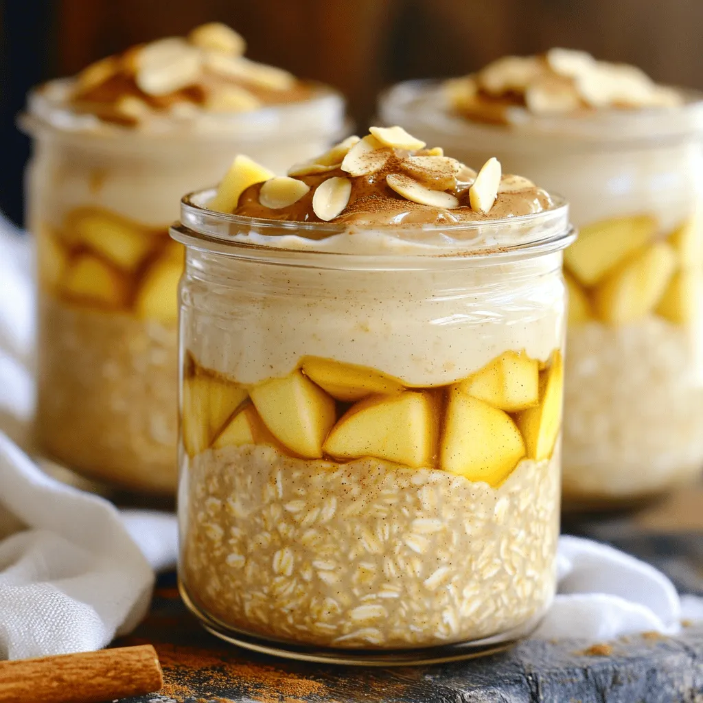 - 1 cup rolled oats - 1 ½ cups almond milk (or your milk of choice) - 2 tablespoons almond butter - 1 medium apple, diced (with skin on) - 1 tablespoon maple syrup (adjust to taste) - 1 teaspoon cinnamon - ¼ teaspoon nutmeg - 2 tablespoons chia seeds - A pinch of salt - Sliced almonds - Additional diced apple - Maple syrup You can easily swap almond milk for any milk you like. Use cow's milk or oat milk if you prefer. If almond butter isn’t your favorite, try peanut butter or sunflower seed butter. For sweetness, adjust the maple syrup to fit your taste. You might like it sweeter or less sweet. You can also use honey or agave syrup as a substitute. For a nut-free option, skip the almond butter and use sunflower seed butter instead. Enjoy mixing and matching to find your perfect blend! To make apple spice almond butter overnight oats, gather all your ingredients first. This simple recipe will take about 10 minutes to prep. You will need rolled oats, almond milk, almond butter, a medium apple, maple syrup, cinnamon, nutmeg, chia seeds, and a pinch of salt. Start by placing the rolled oats in a large mixing bowl. Pour in 1 ½ cups of almond milk. Next, add 2 tablespoons of almond butter. Then, toss in the diced apple, maple syrup, cinnamon, nutmeg, chia seeds, and a pinch of salt. Use a whisk to mix everything together. Make sure the almond butter blends well with the other ingredients. Once mixed, divide the mixture into two jars or containers. Seal the jars tightly and place them in the refrigerator. Let the oats soak overnight, or for at least 6 hours. This soaking time allows the oats and chia seeds to absorb the almond milk and flavors. In the morning, stir the oats well. If they feel thick, add a splash of almond milk to get the right texture. Enjoy your oats straight from the jar or in a bowl. Add toppings like sliced almonds, more apple, or maple syrup for extra flavor. To get the best texture for your overnight oats, start with the right ratio. I suggest using 1 cup of rolled oats to 1.5 cups of almond milk. This mix allows the oats to soak up the liquid well. If your oats feel too thick in the morning, just add a splash of almond milk. Stir it in to reach a creamier texture. To boost the taste, use fresh spices. I love adding cinnamon and nutmeg, which give a warm aroma. Maple syrup sweetens the dish, but adjust it to your preference. For a nutty kick, almond butter is a must. You can even add a pinch of salt to balance the sweetness. Experiment with these flavors to find your perfect mix. How you serve your oats can make them more appealing. Use clear jars or bowls to show off the lovely layers. Top with sliced almonds and extra diced apples for a nice crunch. A sprinkle of cinnamon on top adds a great finishing touch. This makes your breakfast not just tasty but pretty too! {{image_2}} You can switch almond butter for other nut butters. Try peanut butter for a classic taste. Cashew butter gives a creamy, rich flavor. If you prefer sunflower seed butter, it works well too. Each nut butter adds its own twist to the oats. Experiment to find your favorite! While apples are tasty, you can use other fruits. Bananas add creaminess and sweetness. Berries like strawberries or blueberries bring a pop of color and flavor. Try diced peaches for a summer vibe. You can mix fruits for a fun combo. Let your taste buds guide you! For a dairy-free version, stick to almond milk or oat milk. These milks keep the oats creamy and delicious. Coconut milk adds a tropical flair, too. If you want to go nut-free, use soy milk or rice milk. These choices make the recipe fit your diet needs! To keep your Apple Spice Almond Butter Overnight Oats fresh, store them in jars with lids. This helps seal in flavor and moisture. Place the jars in the fridge right after making them. Make sure your fridge is at a cool temperature to maintain quality. These oats last for about three to five days in the fridge. If you want to keep them longer, you can freeze them. Just make sure to use freezer-safe jars. When freezing, leave some space at the top of the jar. This allows the oats to expand as they freeze. They will stay good for up to three months. When you’re ready to eat, take the oats out of the fridge or freezer. If frozen, let them thaw in the fridge overnight. For reheating, just warm them in the microwave. Heat in short bursts, stirring in between. If the oats seem too thick, add a splash of almond milk to loosen them up. Enjoy your tasty breakfast! Yes, you can make these overnight oats up to three days ahead. Just mix all the ingredients and store them in jars. This makes breakfast easy and quick. I love to prepare a few jars on Sunday for busy mornings. You can easily change the sweetness by adding more or less maple syrup. Start with one tablespoon and taste it. If you want it sweeter, add more syrup. You can also use honey or a sweetener of your choice. Just remember to stir well after adding! If you want to switch up the oats, you can use steel-cut oats or quick oats. Steel-cut oats will give a chewier texture. Quick oats will be softer and may absorb more liquid. You can also try gluten-free oats if needed. Just make sure to adjust the liquid for each type! This article covered everything you need to know about overnight oats. We discussed key ingredients, easy instructions, and helpful tips. You can mix and match toppings for flavor. Remember to store them right to keep them fresh. Try different nut butters and fruits for fun variations. Overnight oats are easy, tasty, and healthy. With this guide, you can get creative and enjoy many delicious meals. Make these oats a regular part of your routine. Enjoy your next bowl of overnight oats!