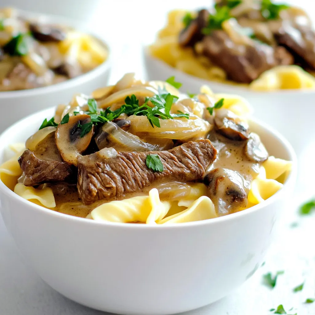 These sauce components create the creamy texture that defines stroganoff. Sour cream adds a tangy flavor. Worcestershire sauce gives it a savory kick. Dijon mustard enhances the taste, while flour thickens the sauce, making it perfect for coating the beef.