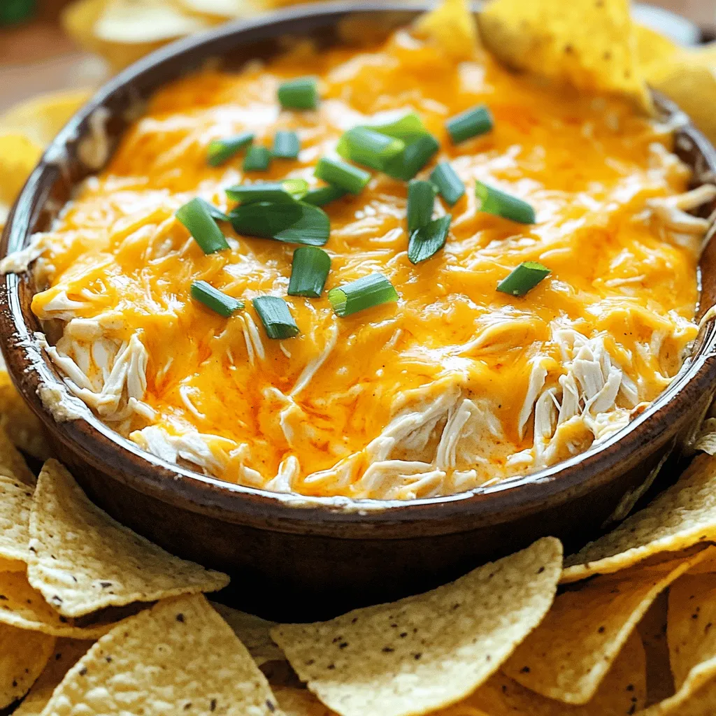 - 2 cups cooked chicken, shredded - 1 cup cream cheese, softened - 1/2 cup ranch dressing - 1/2 cup buffalo sauce - 1 cup shredded cheddar cheese - 1/2 cup crumbled blue cheese (optional) - 1/4 cup green onions, chopped You can swap ranch dressing for a yogurt-based dressing. This keeps the dip creamy but adds a tang. If you want, you can try other dressings, like Caesar or Italian. For the cheese, you can use Monterey Jack or pepper jack instead of cheddar. This gives a new twist to the flavor. If you like your dip spicy, add more buffalo sauce. For less heat, use less buffalo sauce or a milder kind. You can also mix in some diced jalapeños for extra kick. With these options, you can make the dip fit your taste. Enjoy experimenting! First, preheat your oven to 350°F (175°C). This step is key for even cooking. While the oven heats, grab a baking dish. A 9x9 inch dish works best for this dip. In a medium mixing bowl, mix the softened cream cheese, ranch dressing, and buffalo sauce. Stir until it is smooth and well combined. Next, add in the shredded chicken. Mix until the chicken is coated. Now, fold in the shredded cheddar cheese. If you like, add crumbled blue cheese for extra flavor. Transfer the mix to your baking dish. Spread it evenly across the bottom. If you love cheese, sprinkle extra shredded cheddar on top. Bake it in the preheated oven for 20-25 minutes. Check for doneness by looking for bubbles. When it’s hot and bubbling, it’s ready! Let it cool for a couple of minutes. Before serving, garnish with chopped green onions for a fresh touch. To get the right creaminess, start with softened cream cheese. This makes mixing easier. I mix it with ranch dressing and buffalo sauce until smooth. You want a dip that spreads well. If it's too thick, add a bit more ranch dressing. For even flavor, combine ingredients in a large bowl. Mix well after adding the shredded chicken. This helps every bite taste great. Don’t forget to fold in the cheeses gently. This keeps the dip fluffy and creamy. Tortilla chips are perfect for dipping. They add a nice crunch. You can also use celery sticks and carrot sticks. These add freshness and color to your spread. For presentation, use a colorful dish. Top the dip with extra cheddar cheese and green onions. This makes it look inviting. You can also serve it with a side of extra ranch dressing. It gives people a choice for dipping. You can prepare this dip a day in advance. Just follow the recipe and store it in the fridge. On the day of your party, just bake it. This saves time and stress. When reheating, place the dip in the oven at 350°F (175°C). Heat it until it’s warm and bubbly. Stir it halfway through to avoid hot spots. This keeps the dip creamy and tasty. {{image_2}} You can turn up the heat in your dip. Add fresh chopped peppers, like jalapeños or serranos. You can also mix in some spicy hot sauce. This gives a nice kick without overpowering the flavor. If you love spice, try using a hotter buffalo sauce. You can even blend in some cayenne pepper for more heat. This dip will wow your guests with its bold taste! Want a lighter dip? Swap out the cream cheese for low-fat cream cheese or Greek yogurt. This keeps the dip creamy but cuts calories. For the ranch dressing, look for a low-fat version. These simple swaps still keep the flavor strong. You can enjoy a guilt-free snack that tastes just as good! If you want a meatless dip, you can easily change it up. Replace the chicken with plant-based proteins like shredded jackfruit or chickpeas. Both options add texture and flavor. You can also use tofu for a creamy element. This makes the dip just as tasty and suitable for everyone. Don't forget to keep the creamy cheese and ranch flavors for that classic taste! To store your Buffalo Ranch Chicken Dip, first let it cool. Place the dip in an airtight container. This helps keep it fresh. The dip stays good in the fridge for about 3 to 4 days. Make sure to seal the container tightly. This keeps out air and moisture. You can freeze Buffalo Ranch Chicken Dip for later use. To do this, put the cooled dip in a freezer-safe container. Leave some space at the top for expansion. It will last for about 2 to 3 months in the freezer. When you are ready to use it, thaw it in the fridge overnight. To maintain texture, reheat it gently. You can add a little extra cream cheese or ranch dressing if it looks dry after thawing. This helps keep it creamy. Reheat your dip slowly to avoid drying it out. The best method is to use the oven. Preheat the oven to 350°F (175°C). Place the dip in an oven-safe dish. Cover it with foil to keep moisture in. Heat it for about 15 to 20 minutes, or until hot. You can also use a microwave. Heat in short bursts, stirring in between, until warm. Enjoy your dip hot and delicious! Yes, you can make this dip ahead of time. I suggest preparing it up to a day in advance. Mix all the ingredients and store them in the fridge. When you're ready to serve, just bake it until hot. This dip stays fresh and tasty for about 3 days in the fridge. You have many great choices for dippables. Here are some ideas: - Tortilla chips - Celery sticks - Carrot sticks - Pita chips - Crackers - Bread slices These options add crunch and freshness. You can even add some sliced veggies for a healthy twist. To change the spice in your dip, adjust the buffalo sauce. If you want it milder, use less sauce. You can also mix in some cream cheese to tone it down. For more heat, add extra buffalo sauce or even some chopped jalapeños. Taste as you go to find your perfect heat level. This blog post covered how to make a tasty Buffalo Ranch Chicken Dip. You learned the key ingredients needed and some helpful substitutions. I shared step-by-step instructions to prep, combine, and bake your dip perfectly. You also found tips on serving, storing, and variations to try. Try making the dip ahead for gatherings or adjust it to fit your taste. With these methods, you’ll