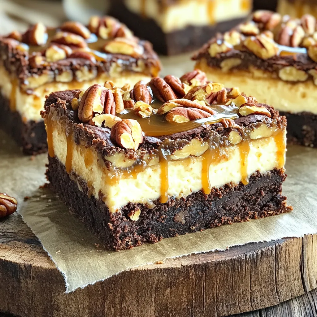 You now have the steps to make delicious brownie cheesecake bars. We covered each layer, from the brownie to the creamy cheesecake. The pecans and caramel make each bite special. Remember to cool and drizzle before serving.
