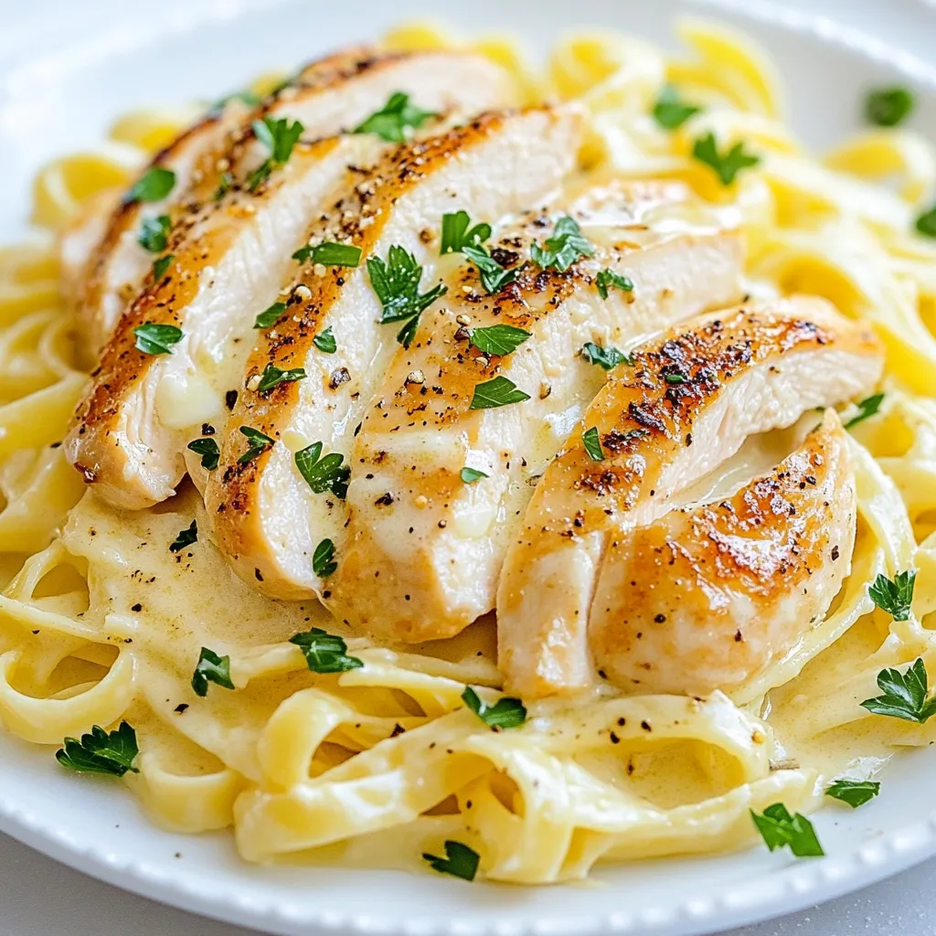A rich and creamy pasta dish featuring tender chicken and a flavorful garlic Alfredo sauce.