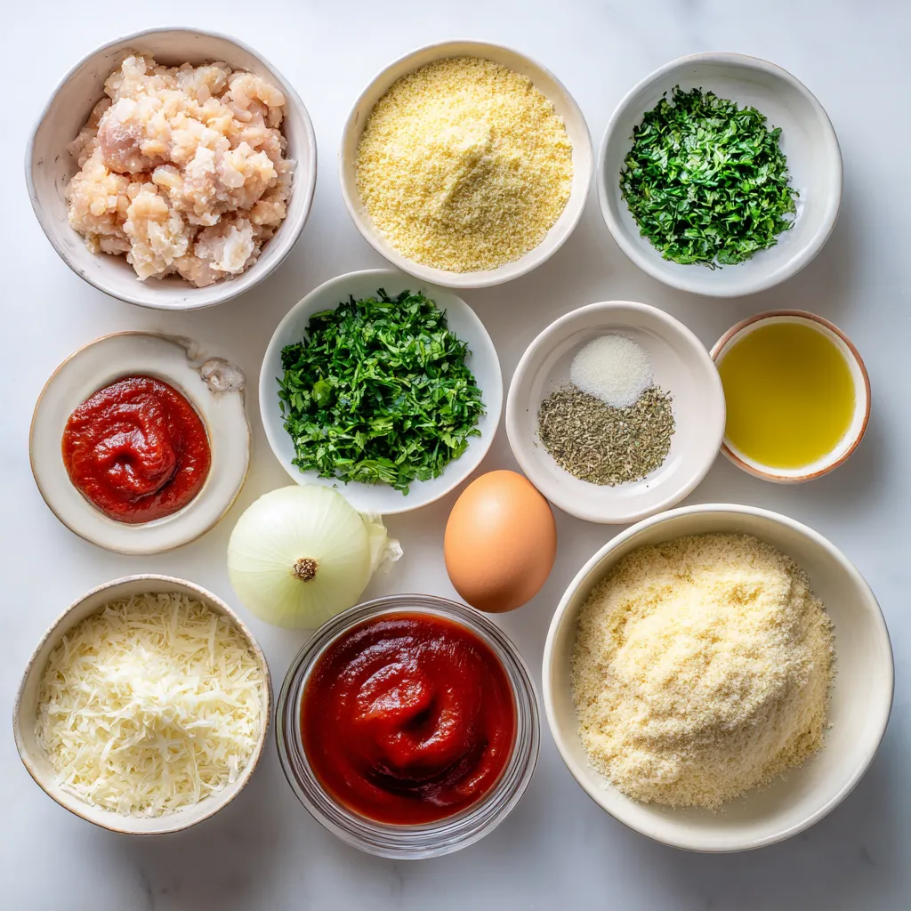 In a large mixing bowl, combine ground chicken, breadcrumbs, grated Parmesan, minced garlic, chopped onion, and fresh parsley.