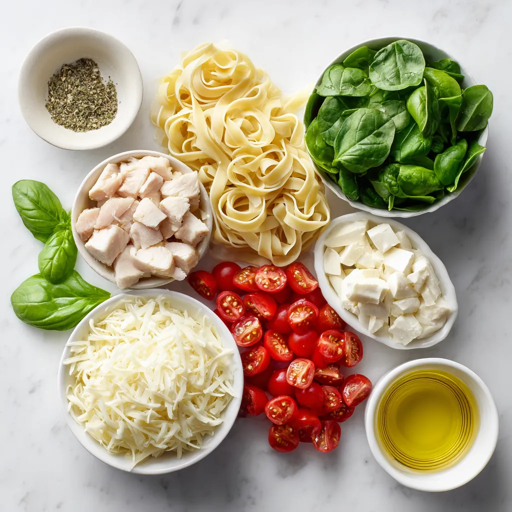 These main ingredients create a tasty and comforting dish. The chicken provides protein, while the pasta gives you that satisfying base. Fresh spinach adds a nice crunch, and cherry tomatoes bring sweetness. Of course, mozzarella cheese ties everything together with its creamy goodness.