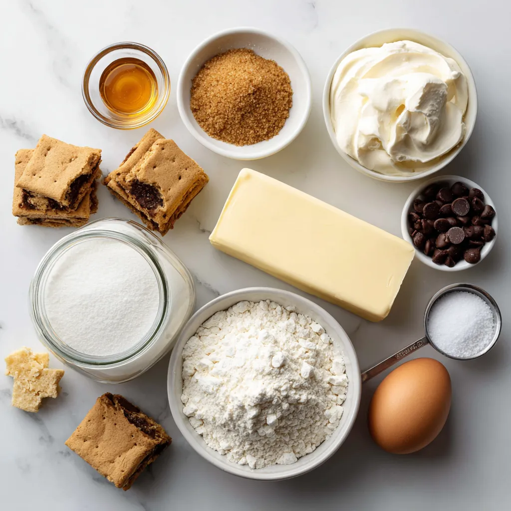 The flour forms the base of the dough, while baking soda helps them rise. Salt enhances the flavors. Chocolate chips add sweetness and richness, and graham crackers bring that classic cheesecake taste.