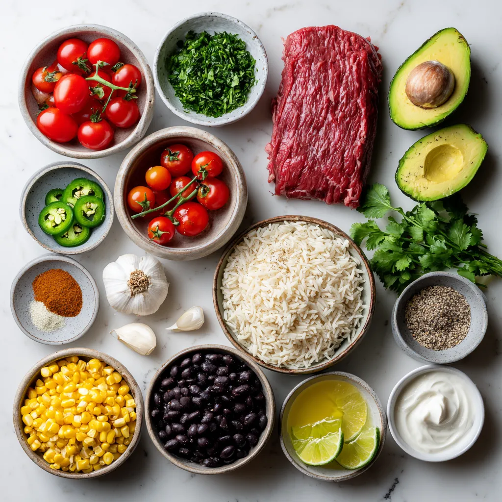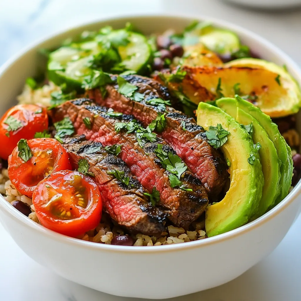 A flavorful bowl featuring marinated flank steak, brown rice, black beans, and fresh toppings.