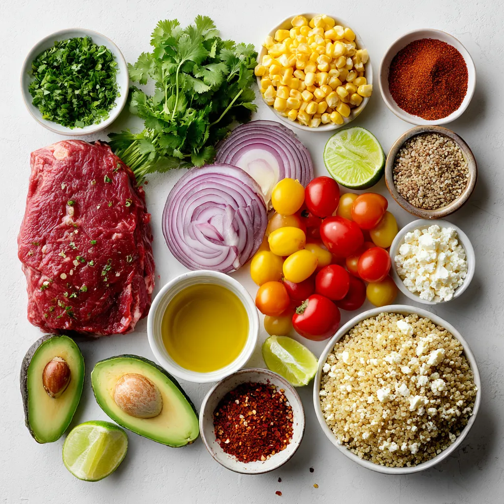In each serving bowl, start with a base of quinoa. Top with sliced grilled steak, halved cherry tomatoes, avocado slices, corn, and red onion.