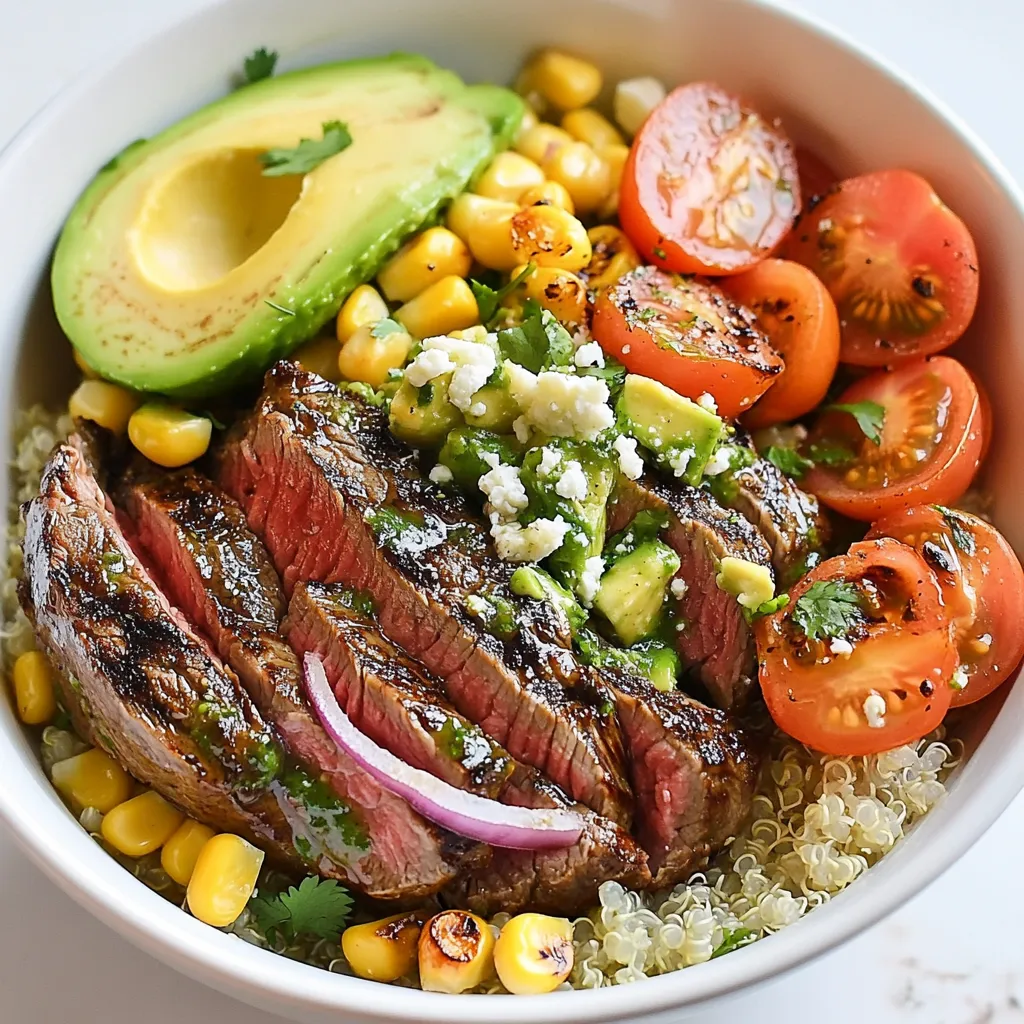 When assembling your bowls, start with a base of fluffy quinoa. Layer the sliced grilled steak on top, then add halved cherry tomatoes, avocado slices, corn, and thin red onion. To enhance the dish, drizzle the reserved marinade on top. For an extra touch, sprinkle crumbled feta cheese and garnish with more cilantro. This makes your dish look fresh and inviting.