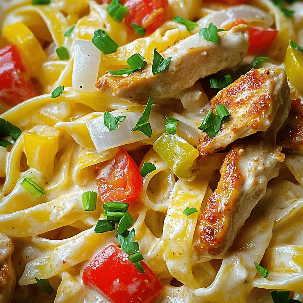 Garlic, onion, and bell pepper create a tasty base. The garlic adds a nice aroma, while the onion and pepper give sweetness. Fettuccine pasta is perfect for holding the creamy sauce. Heavy cream makes the sauce rich and smooth.