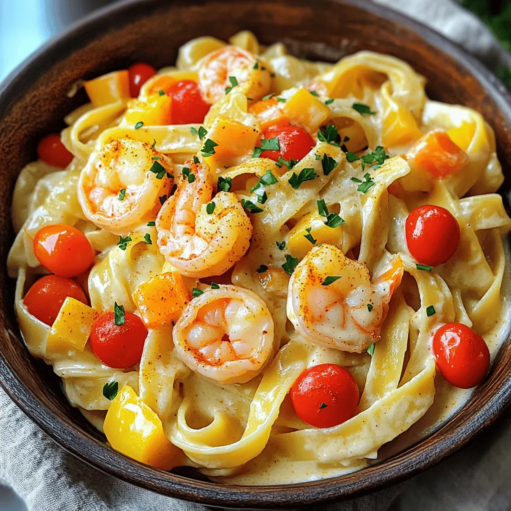 - 8 oz fettuccine or linguine pasta - 1 lb shrimp, peeled and deveined - 2 tablespoons Cajun seasoning - 1 small onion, finely chopped - 3 cloves garlic, minced - 1 cup bell pepper, diced (red or yellow) - 1 cup heavy cream - 1 cup cherry tomatoes, halved - 1/2 cup grated Parmesan cheese - 3 tablespoons olive oil Gather these ingredients to create a flavorful meal. I love using fettuccine or linguine for this dish. They hold the sauce well. The shrimp adds a tender protein that pairs perfectly with the creamy sauce. Cajun seasoning gives it a spicy kick, making each bite exciting. For aromatics, onion, garlic, and bell pepper bring depth to the dish. They create a fragrant base when sautéed. The sweetness of the bell pepper balances the spice from the Cajun seasoning. The sauce is the star. Heavy cream makes it rich and smooth. Cherry tomatoes add a burst of freshness and color. Parmesan cheese enhances the flavor, making it even more delicious. Lastly, olive oil is essential for cooking the aromatics and shrimp. These ingredients come together to create a creamy Cajun shrimp pasta that’s sure to impress. You can easily adjust the spice level to fit your taste. Enjoy the process of cooking and savoring this delightful dish! Start by bringing a large pot of salted water to a boil. Use about 1 tablespoon of salt for a great flavor. Once the water boils, add 8 ounces of fettuccine or linguine pasta. Cook the pasta until al dente, which usually takes about 8-10 minutes. This means it should be firm but not hard. Drain the pasta and set it aside. Remember to save 1/2 cup of that pasta water for later. Take 1 pound of shrimp, which should be peeled and deveined. In a bowl, toss the shrimp with 2 tablespoons of Cajun seasoning. Make sure each shrimp gets coated well. Set them aside to let the flavors soak in. In a large skillet, heat 3 tablespoons of olive oil over medium heat. Add the finely chopped small onion and 1 cup of diced bell pepper. Cook these for about 3-4 minutes until they start to soften. Then, stir in 3 cloves of minced garlic. Sauté for about 30 seconds until you can smell the garlic. Reduce the heat to low and pour in 1 cup of heavy cream. Stir it gently to mix with the veggies. Add in 1 cup of halved cherry tomatoes. Cook this for about 2 minutes until the tomatoes soften just a bit. Now, it’s time to bring everything together! Add the cooked pasta to the skillet. Toss everything together until the pasta is well coated with the creamy sauce. If the sauce looks too thick, use that reserved pasta water to loosen it up a bit. Stir in 1/2 cup of grated Parmesan cheese and sprinkle with salt and pepper to taste. Divide the creamy Cajun shrimp pasta among plates. For a lovely touch, garnish each plate with chopped fresh parsley. This adds color and a fresh taste that brightens the dish. Enjoy your flavorful dinner delight! To make a great cream sauce, you need to adjust the thickness. If your sauce is too thick, add a bit of the reserved pasta water. This helps loosen it up. If it's too thin, let it cook a bit longer to reduce. To enhance flavors, try adding more spices. A pinch of cayenne or paprika can add warmth. Fresh herbs, like thyme or basil, also boost the taste. Cook shrimp just right for the best texture. They only need about 2-3 minutes of cooking. When they turn pink, they are done. Overcooking makes shrimp rubbery and tough. Keep an eye on them as they cook. They should be firm and juicy. You can switch up the pasta for this dish. Fettuccine and linguine work well, but penne or even spaghetti can be good choices. If you need a gluten-free option, try rice pasta or zucchini noodles. These alternatives can still hold the creamy sauce well. {{image_2}} You can give your creamy Cajun shrimp pasta a spicy twist. Add more Cajun seasoning to boost the heat. This gives the dish a bold flavor. You can also incorporate hot sauce. A few drops will enhance the spice level. Try different hot sauces for unique flavors. You can make this pasta even healthier with veggies. Adding spinach or zucchini works great. These veggies add color and nutrients. Other veggies to try include mushrooms or asparagus. They bring great texture and flavor to the dish. Feel free to mix and match based on your taste! If you want to switch up the protein, replace shrimp with chicken. Cook the chicken until golden and fully cooked. Vegetarian options also work well. You can use chickpeas or tofu for a meat-free meal. Both options soak up the creamy sauce nicely. To keep your creamy Cajun shrimp pasta fresh, store it in an airtight container. Refrigerate it right after it cools down. This helps keep the flavors intact. The shelf life is about 3 to 4 days in the fridge. Make sure to check for any signs of spoilage before eating. To reheat, you can use the microwave or a skillet. If using a microwave, heat in 30-second intervals. Stir in between to heat evenly. For a skillet, add a splash of water or cream to help keep the sauce smooth. Be careful not to overcook the shrimp; they can become rubbery. Heat just until warm to enjoy the best texture. You can freeze creamy Cajun shrimp pasta for later meals. Portion it into small containers. Leave some space in each container for expansion. When ready to eat, defrost it in the fridge overnight. Then reheat it gently on the stove or microwave. This keeps the flavors and texture nice. Yes, you can make this dish ahead. Store the pasta and sauce separately. This keeps the pasta from getting soggy. When ready to eat, just reheat and combine. Use a pan on low heat to warm it up. Add a little water if it’s too thick. This dish tastes great even after a day in the fridge. If you want a lighter version, use half-and-half instead of heavy cream. You can also try coconut milk for a dairy-free option. For a tangy flavor, use Greek yogurt. Just mix it in slowly to avoid lumps. These alternatives still give you a creamy texture. Making Cajun seasoning is easy. Mix thes