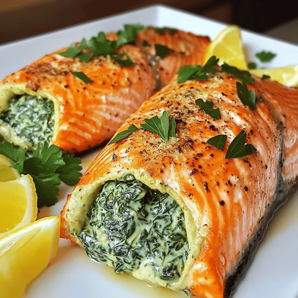 If you cannot find fresh spinach, you can use frozen spinach. Make sure to thaw and drain it well. For the cream cheese, you can try ricotta or Greek yogurt for a lighter option. If you need a dairy-free version, use a vegan cream cheese. You can also swap the salmon for other fish like trout or chicken breast if you prefer.