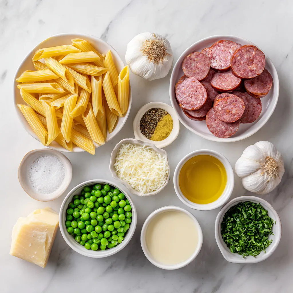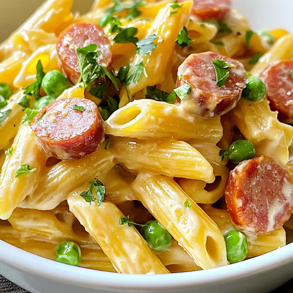 A delicious and creamy pasta dish featuring kielbasa sausage and peas.