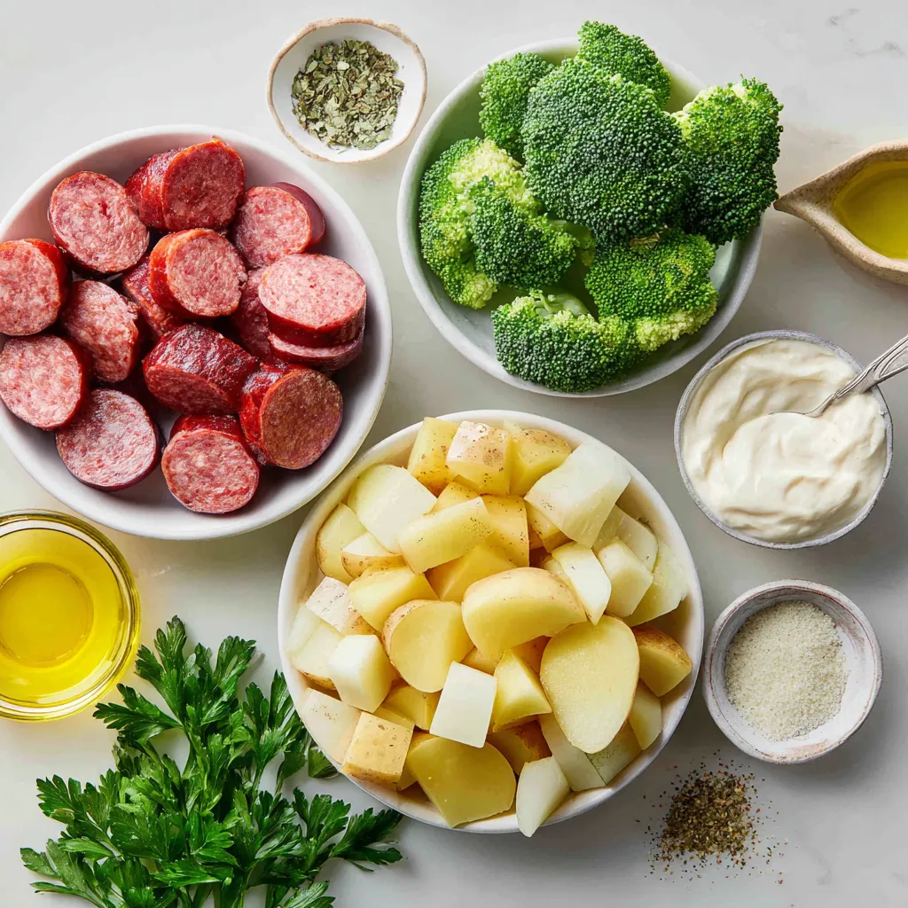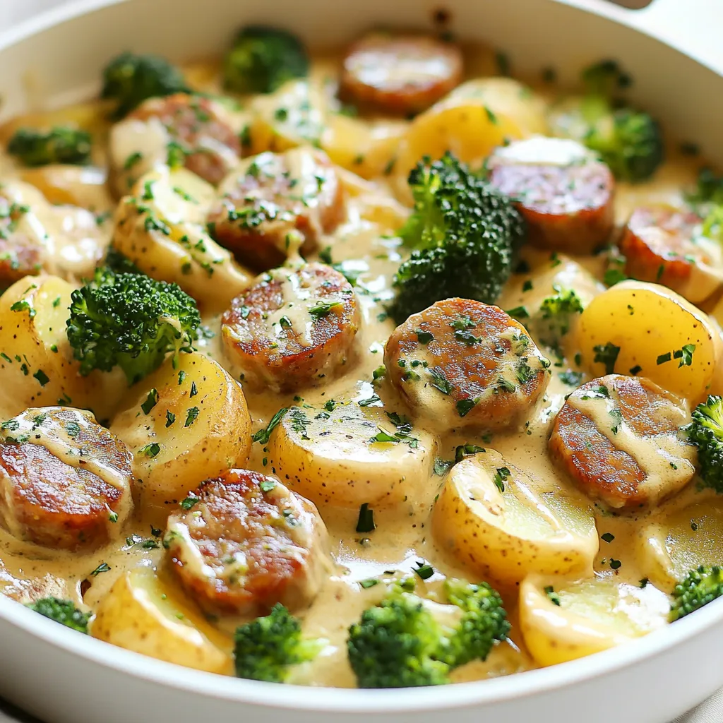 - 1 pound smoked sausage, sliced - 4 medium potatoes, diced - 1 cup broccoli florets - 1 cup heavy cream - 1 packet ranch dressing mix (around 1 oz) - 1 tablespoon olive oil - 1 teaspoon garlic powder - 1 teaspoon onion powder - Salt and pepper to taste - Fresh parsley, chopped {{ingredient_image_1}} First, grab a large skillet and heat one tablespoon of olive oil over medium heat. Add the sliced sausage to the hot oil. Sear the sausage for about 5 to 7 minutes. You want it to get a nice brown color. When it’s done, remove the sausage from the skillet and set it aside on a plate. In the same skillet, add the diced potatoes. Season them with one teaspoon of garlic powder, one teaspoon of onion powder, salt, and pepper to taste. Cook the potatoes for about 10 to 12 minutes. Stir them occasionally. You want them to become tender and golden. Check them often to make sure they don’t burn. Next, stir in the broccoli florets. Cook for an additional 5 minutes until the broccoli is tender. Reduce the heat to low and return the cooked sausage to the skillet. Pour in one cup of heavy cream. Sprinkle the ranch dressing mix over the top. Stir well to combine all the ingredients. Let the mixture simmer for another 5 to 7 minutes. Stir occasionally until everything is heated through and the sauce thickens slightly. To ensure your potatoes are tender, cut them into small, even pieces. This helps them cook evenly. Cook them for about 10-12 minutes, stirring often. Check for a golden color and a fork-tender texture. Avoid overcooking, as they can turn mushy. For the creamy consistency, add heavy cream slowly. This lets you control the thickness. Stir well after adding the ranch dressing mix. Simmer gently for 5-7 minutes. This helps the sauce thicken and flavors blend nicely. You can enhance flavor by adding fresh herbs. Try thyme or rosemary for a nice touch. A dash of paprika adds a bit of warmth. If you like more spice, consider a pinch of red pepper flakes. To modify the creaminess, adjust the amount of heavy cream. Use less for a lighter dish. If you want it richer, add more cream. Taste as you go, and adjust seasoning too. For a complete meal, serve with a simple green salad. A side of crusty bread pairs well too. It helps soak up the creamy sauce. When it comes to presentation, serve straight from the skillet. This adds a rustic charm. Garnish with fresh parsley for a pop of color. It makes the dish look even more inviting. Pro Tips Choose the Right Potatoes: Yukon Gold or red potatoes are ideal for this dish as they hold their shape well and provide a creamy texture. Don’t Rush the Sausage: Allow the sausage to brown properly in the skillet for a richer flavor that enhances the overall dish. Make it Healthier: Consider using a lighter cream or replacing some of the cream with chicken broth for a lower-calorie option. Experiment with Vegetables: Feel free to add other veggies like bell peppers or spinach for extra nutrients and flavor variety. {{image_2}} You can change the sausage type to chicken or turkey. These options keep the dish light. If you prefer a vegetarian approach, try using plant-based sausage. For seafood lovers, shrimp adds a nice touch. Bacon can also boost the flavor. Just remember to cook it first, then follow the same steps. Feel free to add more veggies. Bell peppers and carrots work well. You can also toss in spinach or zucchini. Seasonal veggies can add freshness. In winter, root vegetables like sweet potatoes are great. In summer, try fresh corn or peas. This dish can adapt to what you have on hand. To make this dish gluten-free, choose a gluten-free ranch mix. The potatoes and cream are naturally gluten-free. For dairy-free options, replace heavy cream with coconut milk or a dairy-free cream. These swaps keep the dish creamy without the dairy. Always check labels to ensure your ingredients fit your dietary needs. To store leftovers safely, let the dish cool down first. Use airtight containers to keep it fresh. Glass or plastic containers work well for this. Store in the fridge for up to three days. Make sure to label the container with the date. The best way to reheat the skillet is on the stove. Use medium heat and add a splash of cream or broth. This keeps the dish creamy. Stir it often to warm it evenly. You can also use a microwave, but cover it to avoid splatters. Heat in short bursts, stirring in between. Yes, this dish can be frozen! To freeze, let it cool completely. Divide it into portions and place them in freezer-safe bags. Remove as much air as possible before sealing. To thaw, place it in the fridge overnight. Reheat it on the stove or microwave when ready to eat. Yes, you can use many types of potatoes. Yukon Gold and red potatoes work best. They hold their shape well and become creamy when cooked. Other options are russet potatoes or fingerling potatoes. They also add nice flavor. Just make sure to cut them into even pieces for even cooking. Leftovers will last for about three to four days in the fridge. Store them in an airtight container. Make sure to let the dish cool before sealing it. This will help keep it fresh. If you want to keep it longer, consider freezing it. You can make this dish dairy-free easily. Use coconut cream or cashew cream instead of heavy cream. Both options add creaminess without dairy. For the ranch dressing mix, look for a dairy-free version at the store. You can also make your own with herbs and spices. This blog post covered how to make a tasty skillet dish with simple ingredients. We talked about key items like smoked sausage, potatoes, and broccoli. You learned step-by-step cooking instructions and tips to perfect texture and flavor. We also explored variations for dietary needs and storage methods. In conclusion, this dish is easy to make and fun to adapt. Try it out and make it your own! Enjoy your cooking adventure and share this recipe with friends!