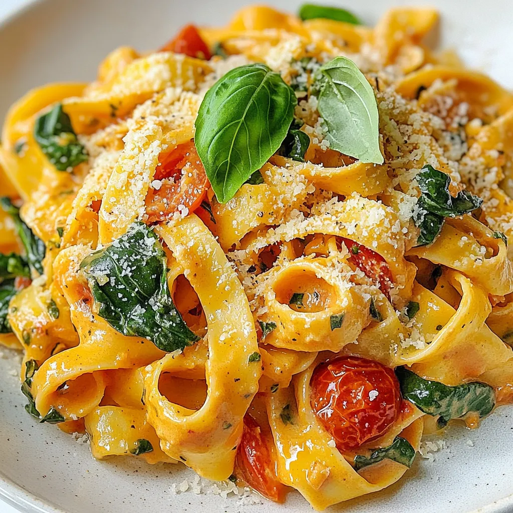 A delicious and creamy pasta dish with garlic, tomatoes, and spinach.