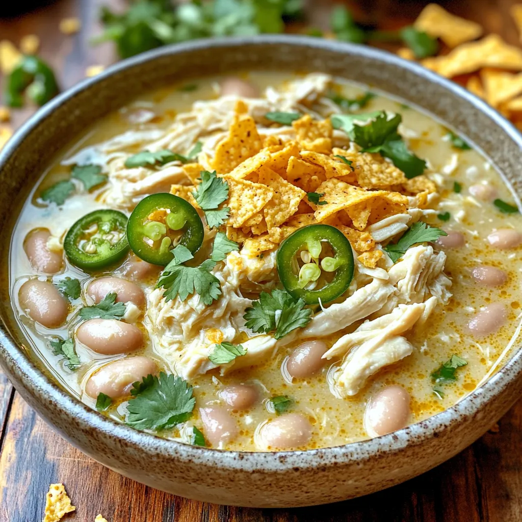 This creamy white chicken chili is full of flavors and warmth. The key ingredients work together to make each bite comforting. First, I use cooked chicken. Rotisserie chicken is my go-to because it saves time and adds great flavor.