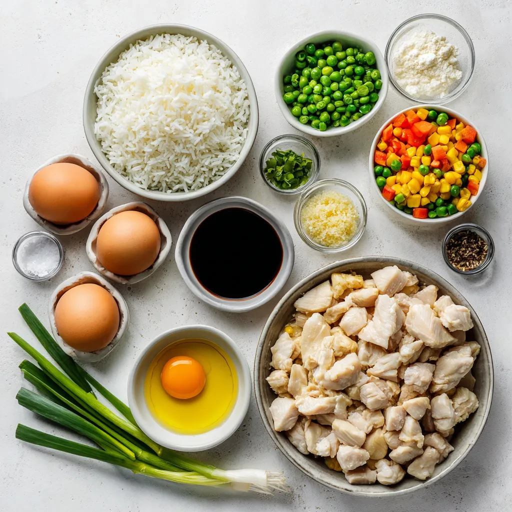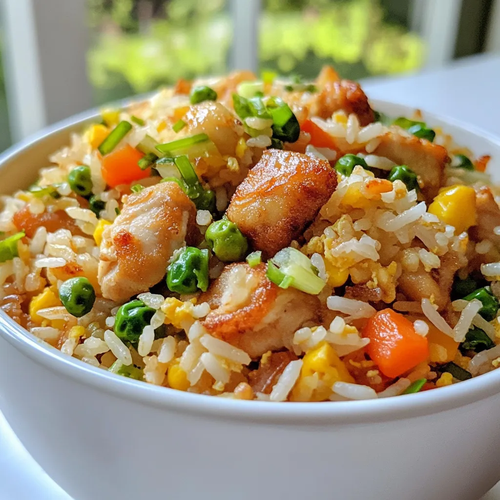 To make Crispy Garlic Chicken Fried Rice, gather these essential ingredients: - 2 cups cooked jasmine rice (day-old preferred) - 1 cup boneless chicken breast, diced - 4 cloves garlic, minced - 1 small onion, finely chopped - 1 cup mixed vegetables (peas, carrots, corn) - 3 tablespoons soy sauce - 2 tablespoons oyster sauce (optional) - 1 tablespoon sesame oil - 2 tablespoons vegetable oil - 2 eggs, beaten - Green onions, sliced for garnish - Salt and pepper to taste Day-old rice works best. It dries out slightly, making it easier to fry. If you don’t have day-old rice, spread freshly cooked rice on a tray to cool. This helps reduce moisture. For substitutions, here are some helpful tips: - You can use brown rice instead of jasmine rice for a healthier option. - Chicken breast can be swapped for tofu or shrimp for a different protein. - If you don’t have mixed veggies, use any fresh or frozen veggies you like. - Soy sauce can be replaced with tamari for a gluten-free option. - Instead of oyster sauce, use hoisin sauce for a sweet twist. These swaps keep your dish tasty while fitting your pantry. Enjoy cooking! {{ingredient_image_1}} Start by preparing the chicken. Take one cup of boneless chicken breast, and cut it into small pieces. Season the chicken with a pinch of salt and pepper. Let it sit for a bit to absorb the flavor. Next, it’s time to fry the chicken. Heat one tablespoon of vegetable oil in a large skillet or wok over medium-high heat. Add the seasoned chicken pieces and cook them for about 5 to 7 minutes. You want them golden and crispy. Once done, remove the chicken from the pan and set it aside. Now, let’s sauté the aromatics for flavor. In the same pan, add another tablespoon of vegetable oil. Toss in four minced garlic cloves and one finely chopped small onion. Sauté these for about 2 to 3 minutes. You want the mixture to be fragrant and the onions to look translucent. After that, add in one cup of mixed vegetables, like peas, carrots, and corn. Stir-fry these for an additional 3 to 4 minutes until they are warmed up. Next, we incorporate the rice. Push the veggies to one side of the pan. If needed, add another tablespoon of vegetable oil. Then, add 2 cups of day-old jasmine rice. Break up any clumps and stir-fry the rice for about 5 minutes. This step is key for getting that crispy texture. Now, mix everything together. Add the cooked chicken back into the pan. Pour in three tablespoons of soy sauce and two tablespoons of oyster sauce if you want a richer flavor. Stir well to coat the rice evenly with the sauces. Then, it’s time to add the eggs. Push the fried rice to one side of the pan. Pour two beaten eggs into the empty space. Scramble the eggs until fully cooked, then mix them into the rice. Finally, drizzle one tablespoon of sesame oil over the fried rice. Taste and adjust the seasoning with salt and pepper as needed. Give it one last stir to combine all the flavors. Serve your Crispy Garlic Chicken Fried Rice hot, garnished with sliced green onions on top. Enjoy this tasty dish! To make Crispy Garlic Chicken Fried Rice, start with day-old rice. Fresh rice is too moist. It clumps together and won’t fry well. Day-old rice is dry and firm. This texture helps get that crispy finish. For crispy fried rice, use high heat. A wok or a large skillet works best. Spread the rice in a thin layer. Don’t crowd the pan. Let it sit in the pan for a few minutes before stirring. This way, it gets nice and crispy. Adjust the seasoning to your taste. Soy sauce adds saltiness, while oyster sauce gives depth. Taste as you go. Add a bit of salt or pepper if needed. You want a balance of flavors. If you like it spicy, add some chili flakes or sauce. Experiment with these tips to make your fried rice just right! Pro Tips Use Day-Old Rice: Day-old jasmine rice is ideal for fried rice as it has dried out slightly, making it easier to fry without becoming mushy. High Heat Cooking: Cooking on high heat helps to achieve that desirable crispy texture in both the chicken and the rice. Customize Your Veggies: Feel free to mix and match vegetables based on your preference or what you have on hand for added flavor and nutrition. Garnish for Freshness: Adding fresh green onions at the end brightens up the dish and adds a pop of color and flavor. {{image_2}} You can switch up the recipe to fit your needs or tastes. - Vegetarian options for Crispy Garlic Fried Rice: Use tofu or tempeh instead of chicken. Both options add protein and flavor. You can also use chickpeas for a different twist. - Other protein alternatives: If you prefer beef or shrimp, those work well too. Just adjust your cooking time. Ground turkey or pork also makes a tasty choice. - Adding different vegetables for flavor: Feel free to mix in bell peppers, broccoli, or zucchini. They add color and crunch. Try adding spinach or kale for a healthy boost. These swaps keep the dish exciting and tasty! To store your Crispy Garlic Chicken Fried Rice, follow these steps: - Cool it down: Let the fried rice sit at room temperature for no more than two hours. This helps avoid bacteria growth. - Use airtight containers: Place the rice in containers that seal tightly. This keeps moisture out and helps maintain flavor. - Label and date: Write the date on the container. This way, you know how long it's been stored. When reheating, you want to keep that perfect texture. Here are some tips: - Use a skillet: Heat a little oil in a pan. Add the rice and stir occasionally. This helps it heat evenly and regain some crispiness. - Add a splash of water: If the rice is too dry, add a few drops of water. Cover the pan for a minute to create steam. This helps rehydrate the rice. You can also freeze Crispy Garlic Chicken Fried Rice if you want to save it for later: - Portion it out: Divide the fried rice into meal-sized portions before freezing. This makes it easy to reheat later. - Use freezer bags: Place the rice in freezer-safe bags and squee