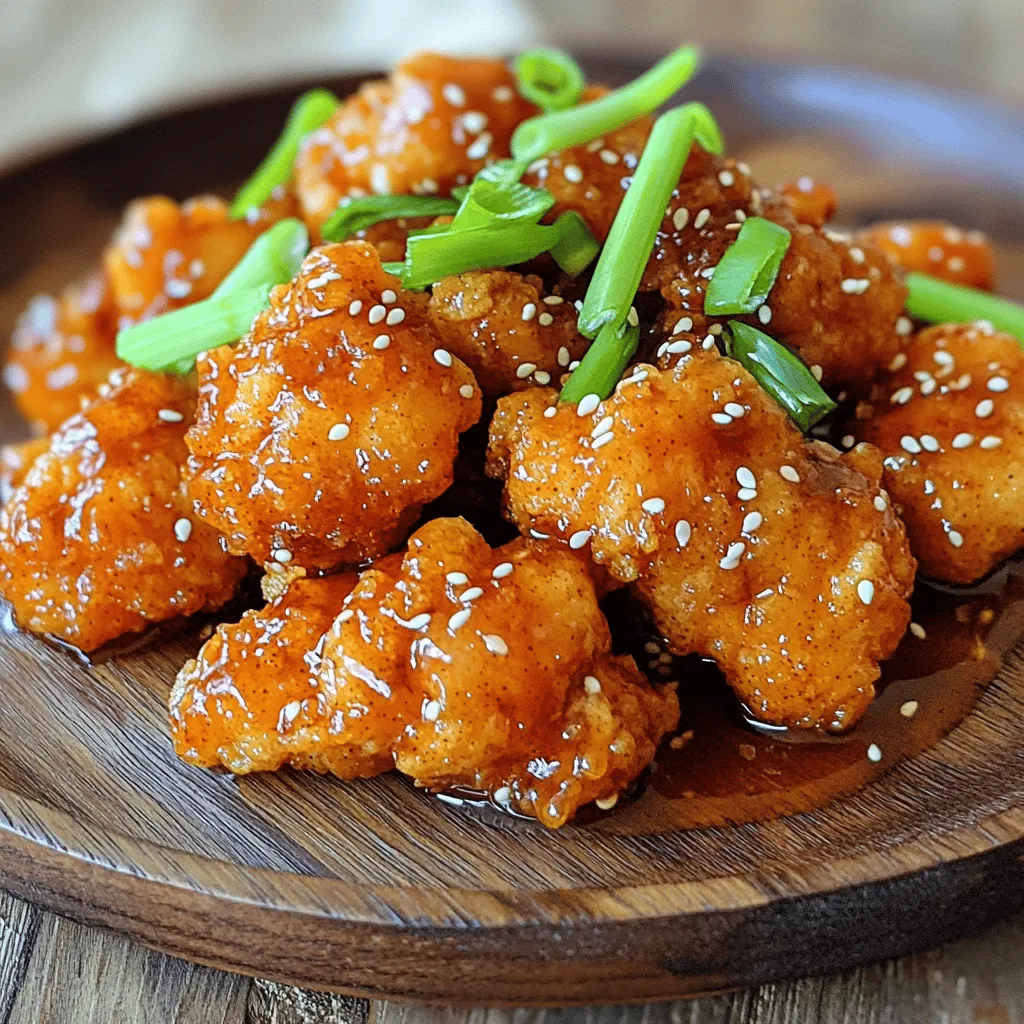 Add the crispy chicken to the sauce. Toss everything quickly to coat each piece well. Sprinkle sesame seeds over the chicken for that extra crunch. Remove from heat. Plate your crispy sesame chicken and add sliced green onions on top. This adds a fresh touch and color. Enjoy your homemade takeout!