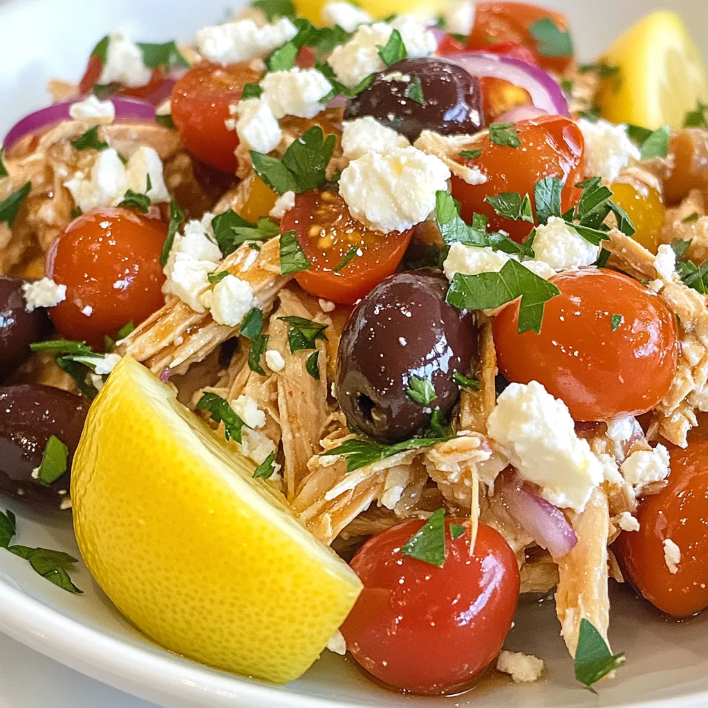 - 4 boneless, skinless chicken breasts - 1 cup cherry tomatoes, halved - 1 medium red onion, sliced For this dish, I love using fresh and simple ingredients. The chicken breasts are the star here. They stay juicy and tender during cooking. Cherry tomatoes add a sweet burst. The red onion gives a nice crunch and flavor. - 1 tablespoon dried oregano - 1 teaspoon dried thyme - Salt and black pepper - Fresh parsley and feta cheese for topping I always season my chicken well. Oregano brings a classic Greek taste. Thyme adds a subtle earthiness. Salt and pepper enhance all the flavors. For garnish, fresh parsley brightens the dish. Feta cheese is a tasty option that adds creaminess. {{ingredient_image_1}} Start by placing the chicken breasts in the crockpot. Make sure they lay flat. Next, season them with salt and pepper. This simple step adds great flavor to the chicken. Use about one teaspoon of salt and half a teaspoon of pepper. In a mixing bowl, combine the cherry tomatoes, sliced red onion, Kalamata olives, and minced garlic. These ingredients bring a fresh taste. Then, mix in a tablespoon of dried oregano and one teaspoon of dried thyme. This adds a lovely herbal note. Stir everything until well blended. Layer the vegetable mixture evenly over the chicken in the crockpot. This will keep the chicken moist as it cooks. In a small bowl, whisk together the juice of one lemon and one-third cup of olive oil. Drizzle this mixture over the ingredients in the crockpot. Finally, cover the crockpot and set it on low for 6 to 8 hours or high for 3 to 4 hours. The chicken is done when it is tender and fully cooked. Once cooked, shred the chicken using two forks. Mix it with the other ingredients for a tasty dish. Enjoy your warm Greek chicken! To ensure chicken remains tender, follow these simple steps: - Use boneless, skinless chicken breasts. They cook evenly and stay juicy. - Cook on low heat for 6 to 8 hours. This slow cooking breaks down fibers. - Avoid lifting the lid while cooking. Each peek releases heat and steam. For the best flavor, consider these tips: - Marinate the chicken in olive oil and lemon juice for a few hours, if time allows. This adds depth. - Use fresh garlic instead of powdered. Fresh gives a stronger, brighter taste. - Mix in herbs like oregano and thyme before cooking. Their flavors infuse the dish beautifully. For ideal sides to complement Greek chicken, think about these options: - Serve it over fluffy quinoa or orzo. These grains soak up the juices well. - Pair with a Greek salad. Fresh cucumbers, tomatoes, and feta add a nice crunch. - Consider roasted vegetables. They provide a wonderful contrast in texture. For presentation tips, focus on these details: - Use a large, colorful plate. A white plate makes the colors pop. - Garnish with fresh parsley and crumbled feta cheese. This adds a nice touch. - Add lemon wedges on the side. They offer a zesty contrast to the dish. Pro Tips Use Fresh Ingredients: Whenever possible, opt for fresh herbs and vegetables to enhance the flavor of your dish. Marinate for Extra Flavor: For even more flavor, consider marinating the chicken in the lemon juice and olive oil mixture for a few hours before cooking. Leftover Versatility: This dish makes great leftovers! Use the shredded chicken in salads, wraps, or as a topping on baked potatoes. Adjust for Spice: If you like a bit of heat, add some red pepper flakes to the vegetable mixture for an extra kick. {{image_2}} You can change up the vegetables in this dish for fun. Try adding zucchini, bell peppers, or spinach. These veggies add color and taste. You can also use different proteins. Swap chicken for pork, beef, or even chickpeas for a plant-based twist. Each option brings a new flavor and texture. To boost the flavor, think about spices or marinades. You can add smoked paprika for a warm taste. A bit of cumin can also give it a nice depth. If you like heat, try adding red pepper flakes or fresh jalapeños. These will spice up your dish and wake up your taste buds. Don’t be afraid to get creative! To keep your Crockpot Greek Chicken fresh, follow these steps: - Refrigeration: After serving, let the dish cool down. Place leftovers in an airtight container. This helps keep out air and moisture. Store in the fridge for up to 3 days. - Freezing: If you want to save more, freezing works great. Use freezer-safe bags or containers. Make sure to remove as much air as possible. It will stay good for up to 3 months. When ready, thaw in the fridge overnight before reheating. When it's time to enjoy your leftovers, reheating is key: - Best Methods: The oven or stovetop is ideal. For the oven, preheat to 350°F (175°C). Place the chicken in a dish, cover with foil, and warm for about 20 minutes. On the stovetop, use a skillet over low heat. Stir occasionally for even warming. - Maintaining Flavor and Texture: To keep the chicken juicy, add a splash of water or broth during reheating. This helps avoid dryness. Stir in fresh parsley before serving for a pop of color and flavor. To cook chicken well, use low heat for 6 to 8 hours. High heat cooks it in 3 to 4 hours. This slow cooking keeps the chicken juicy and tender. Always check that the chicken reaches 165°F for safety. Yes, you can use frozen chicken breasts! If they are frozen, add an hour to the cooking time. This means you will cook on low for 7 to 9 hours or high for 4 to 5 hours. Always ensure the chicken is fully cooked and tender. I love to serve this Greek chicken with fluffy quinoa or orzo. These grains soak up the tasty juices. You can also add a fresh salad or roasted veggies on the side. For extra zing, serve lemon wedges as well. This blog post walks you through making delicious Crockpot Greek Chicken. We covered key ingredients like chicken breasts, cherry tomatoes, and red onions. You learned to season well and how to layer flavors. Tips for tenderness and serving suggestions highlighted the best ways to enjoy this dish. Lastly