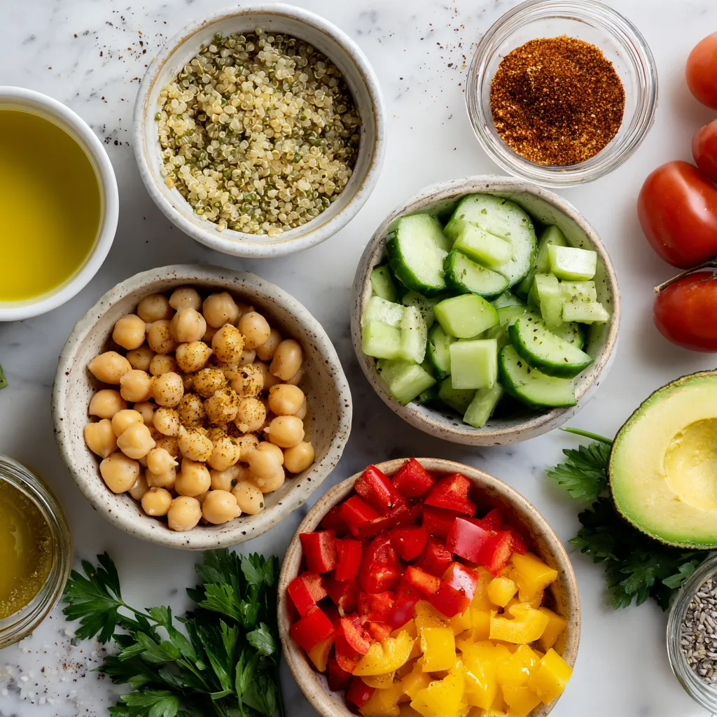 While the quinoa cooks, it’s time to chop. Cut 1 cup of cherry tomatoes in half. Dice 1 cup of cucumber and 1 bell pepper of any color. If you use canned chickpeas, drain and rinse 1 cup. In a large bowl, mix the tomatoes, cucumber, bell pepper, and chickpeas. Now for the dressing! In a small bowl, whisk together 2 tablespoons of olive oil, 1 tablespoon of lemon juice, 1 teaspoon of cumin, and 1 teaspoon of smoked paprika. Add salt and pepper to taste. This dressing will add flavor to your bowl.