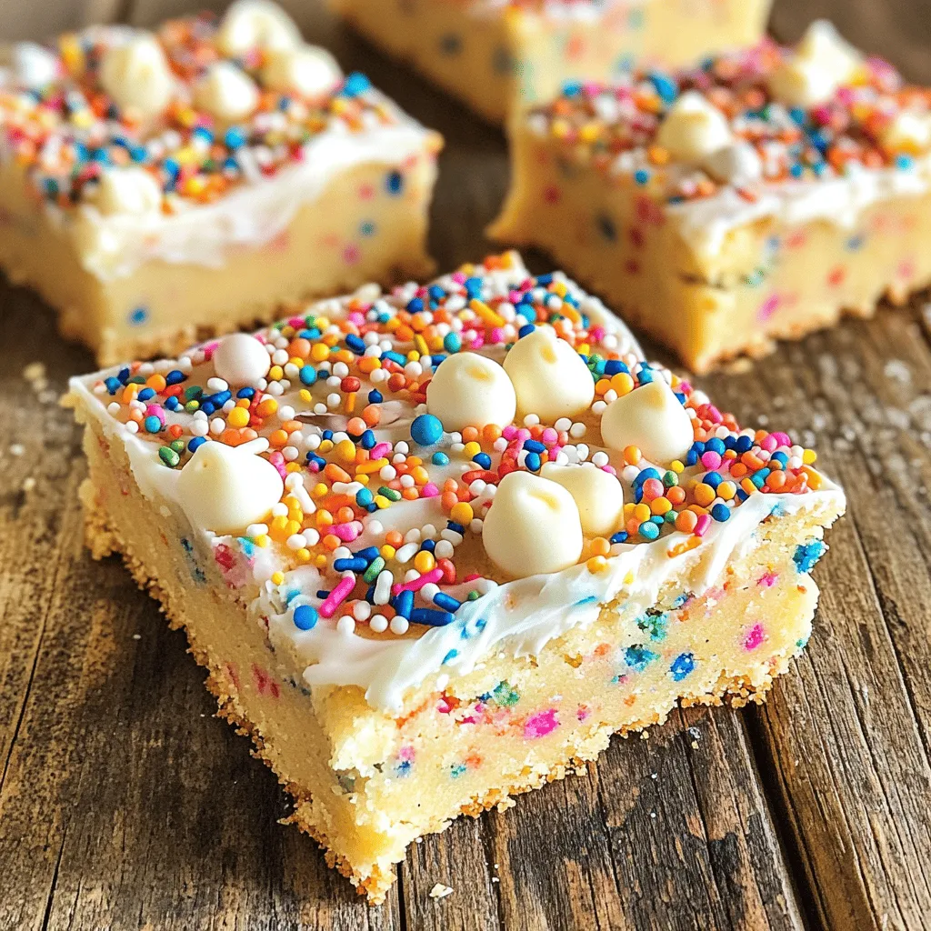 - 2 ½ cups all-purpose flour - 1 teaspoon baking soda - ½ teaspoon salt The dry ingredients form the base of our cookie bars. I use all-purpose flour for a soft and chewy texture. Baking soda gives the bars a light lift, while salt adds balance to the sweetness. - 1 cup (2 sticks) unsalted butter, softened - 1 cup granulated sugar - ½ cup brown sugar, packed - 2 large eggs - 2 teaspoons vanilla extract For the wet ingredients, I start with softened unsalted butter. It mixes well and creates a rich flavor. The granulated and brown sugars blend together, adding sweetness and depth. Eggs help bind the mixture, while vanilla extract gives a warm aroma. - ½ cup rainbow sprinkles (plus extra for topping) - 1 cup white chocolate chips - Optional: Frosting ingredients Sprinkles are key to the fun in Funfetti bars! I fold in half a cup into the dough for color and crunch. White chocolate chips add a creamy sweetness. If you want frosting, I suggest using a mix of butter, powdered sugar, cream, and vanilla for a smooth finish. These ingredients come together to create a treat that is fun, colorful, and oh-so-delicious! First, preheat your oven to 350°F (175°C). This step is key to baking your bars evenly. Next, grab a 9x13-inch baking dish. Line it with parchment paper, leaving some paper hanging over the edges. This helps you lift the bars out easily when they’re done. In a medium bowl, whisk together the dry ingredients. You need 2 ½ cups of flour, 1 teaspoon of baking soda, and ½ teaspoon of salt. This mixture is the base of your cookie dough. In a large mixing bowl, beat the soft butter, granulated sugar, and brown sugar until creamy. This takes about 2-3 minutes. Next, add 2 large eggs one at a time, mixing well after each. Stir in 2 teaspoons of vanilla extract for a sweet flavor. Now, gradually add the dry mix to the wet mix. Stir until just combined. It’s important not to overmix, or your bars may turn tough. Fold in ½ cup of rainbow sprinkles and 1 cup of white chocolate chips. Use a spatula to make sure they spread evenly. Then, pour the dough into the prepared dish. Spread it out evenly. Bake the bars in the preheated oven for 22-25 minutes. They are done when the edges are golden and the center looks set. A toothpick should come out with a few moist crumbs, but not wet batter. Once baked, let them cool before frosting, if you choose to add it. To get the best texture for your Funfetti Sugar Cookie Bars, avoid overmixing the dough. When you combine the wet and dry ingredients, mix just until they come together. Overmixing can make the bars tough. After baking, check for doneness with a toothpick. Insert the toothpick in the center of the bars. If it comes out mostly clean with a few moist crumbs, they are ready. For a smooth and fluffy frosting, keep your butter at room temperature. Soft butter blends well with powdered sugar. If your frosting is too thick, adjust the consistency with heavy cream or milk. Just add a little at a time until it is perfect for spreading. To cut the bars for uniform pieces, use a sharp knife. Clean the knife between cuts to keep edges neat. You can serve them plain for a simple treat. For a fun twist, add frosting and extra sprinkles on top. This makes each bite even more joyful and festive! {{image_2}} You can make funfetti sugar cookie bars even more fun! Try different sprinkles, like chocolate or pastel colors. Want to add more texture? You can mix in nuts like walnuts or pecans. Dried fruits, such as cranberries or raisins, also work well. These changes will give your bars a unique twist. Do you need a vegan option? Substitute butter with coconut oil or a plant-based butter. For eggs, use mashed banana or applesauce as an egg replacer. If you’re gluten-free, swap out regular flour with almond or coconut flour. These swaps will keep your bars tasty and safe for everyone. Make your funfetti bars fit any season! Use themed sprinkles for holidays like Christmas or Halloween. You can even change flavors to match the time of year. Think pumpkin spice in fall or peppermint in winter. These small changes can make your cookie bars festive and fun for any occasion! To keep your Funfetti sugar cookie bars fresh for 3-5 days, store them in a cool, dry place. Place the bars in a single layer on a plate or in a small container. If you stack them, use parchment paper between layers to prevent sticking. This simple step helps maintain their soft texture and yummy flavor. Freezing these bars is easy and smart if you want to enjoy them later. Once the bars cool completely, cut them into squares. Wrap each square tightly in plastic wrap or foil. Place the wrapped bars in a freezer-safe bag or container. This way, they can stay fresh for up to three months. When you want to eat one, just let it sit at room temperature for about an hour, or warm it in the microwave for a few seconds. For optimal freshness, use airtight containers to store your Funfetti bars. Glass or plastic containers with a secure lid work best. These containers keep air out and moisture in. This method helps preserve the bars’ delicious taste and soft texture. Plus, it makes grabbing a treat quick and easy! Yes, you can use different types of chocolate chips. Milk chocolate chips add sweetness. Dark chocolate chips bring a rich flavor. You can mix and match to suit your taste. Just keep the amount the same, about one cup. To store leftover bars, place them in an airtight container. Keep the container at room temperature for 3-5 days. If you want them to last longer, freeze them. Wrap each bar in plastic wrap, then put them in a freezer bag. This helps prevent freezer burn. If you want a vegan option, use flaxseed meal or applesauce. For flaxseed, mix one tablespoon with three tablespoons of water. Let it sit until it thickens. This replaces one egg. Use a quarter cup of applesauce for one egg too. Both options work well in the recipe. Yes, you can serve these bars without frosting. They t