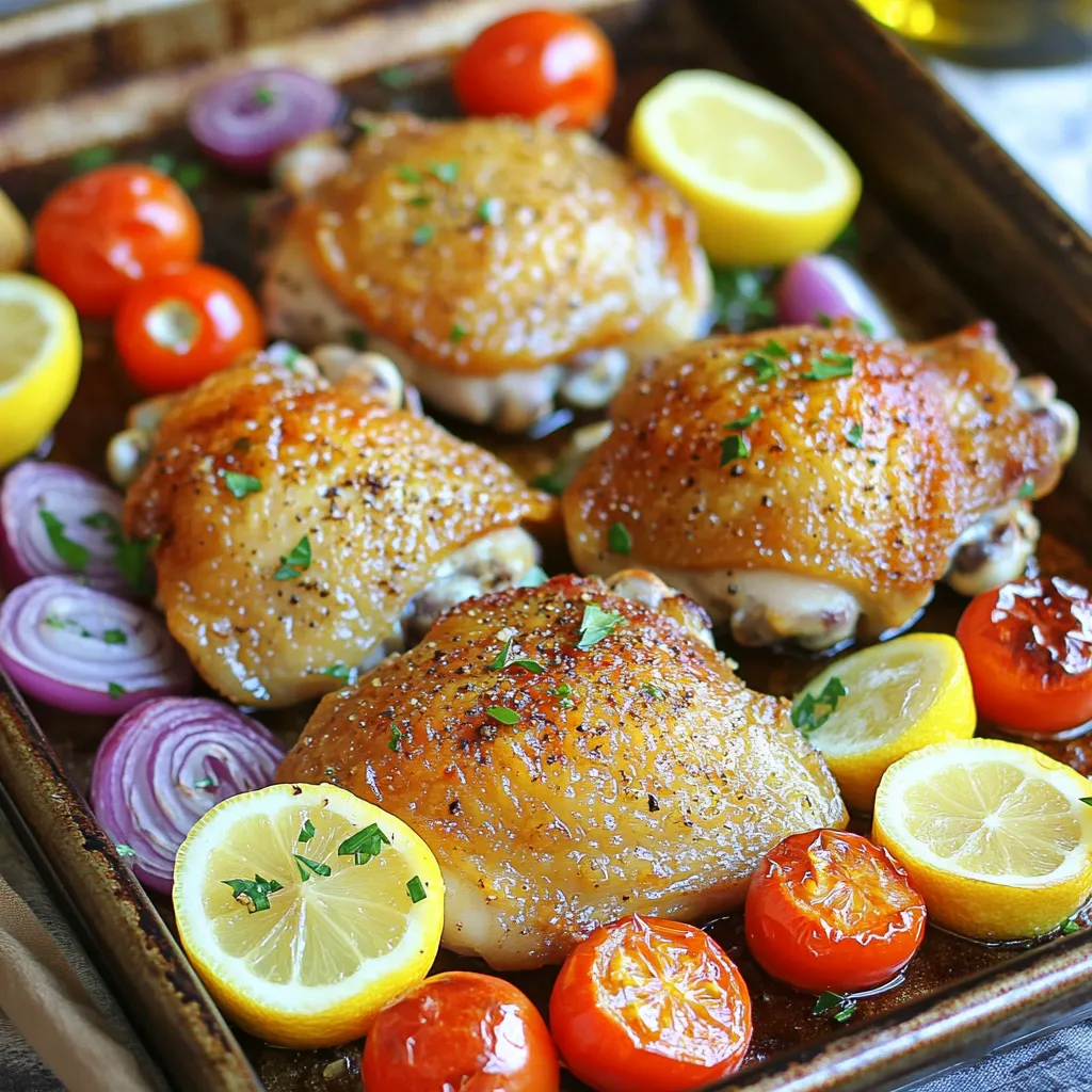 In this dish, chicken thighs shine with flavor. The skin keeps the meat juicy and tender. Olive oil adds richness, while garlic brings a robust taste. Lemons brighten the dish, adding a touch of zest. Oregano and paprika round out the flavors, giving warmth and depth. Cherry tomatoes burst with sweetness, enhancing the overall dish. Red onions add a mild sharpness and nice texture. Finally, fresh parsley elevates the presentation, making it pop.