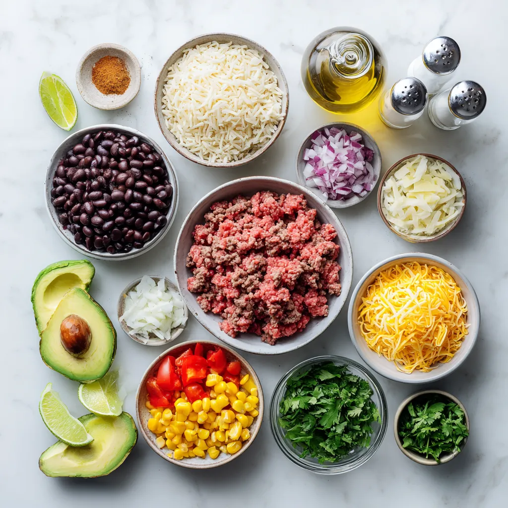 These ingredients create a tasty and colorful meal. Each component plays a role. The ground beef adds protein and flavor. The brown rice forms a great base. Black beans and corn add texture and nutrition. Fresh veggies like bell pepper, onion, and garlic bring brightness and crunch.