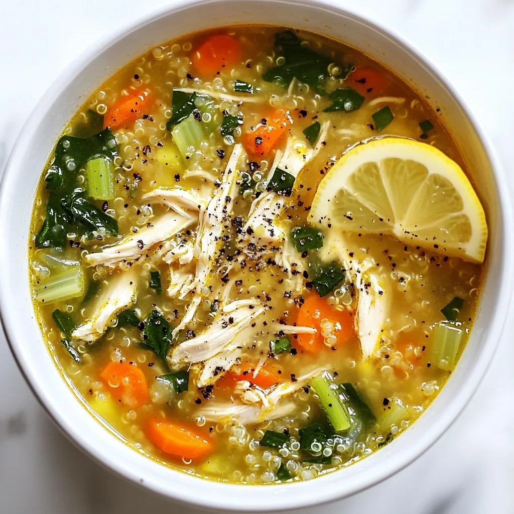 - 2 cups cooked shredded chicken breast - 1 cup quinoa, rinsed - 6 cups low-sodium chicken broth - 1 large carrot, diced - 1 celery stalk, diced - 1 cup spinach, chopped - 1 onion, diced - 3 cloves garlic, minced - 1 teaspoon dried thyme - 1 teaspoon dried oregano - Salt and pepper to taste - 1 tablespoon olive oil - Juice of 1 lemon This high protein chicken soup packs a punch with its hearty ingredients. The cooked shredded chicken breast serves as the main protein source, keeping you full and satisfied. Quinoa adds even more protein while bringing a nutty flavor and chewy texture. For the base, use low-sodium chicken broth to keep it flavorful but not too salty. The vegetables in this soup are key to its nutrition. I like to use diced carrots and celery for crunch. Spinach adds vibrant color and a wealth of vitamins. Onions and garlic boost the flavor profile. They create a rich, savory foundation for the soup. For seasoning, I use dried thyme and oregano. These herbs bring warmth and depth to the dish. Salt and pepper enhance all the flavors, making the soup irresistible. Lastly, the olive oil adds healthy fats. The squeeze of lemon juice brightens the soup, balancing the flavors perfectly. Each ingredient is chosen for taste and nutrition, making this soup a nourishing choice for any meal. {{ingredient_image_1}} To start, heat 1 tablespoon of olive oil in a large pot over medium heat. Once the oil is hot, add 1 diced onion. Sauté it for about 3-4 minutes until it looks clear. This step brings out the sweet flavor of the onion. Next, add 3 minced garlic cloves, 1 diced carrot, and 1 diced celery stalk. Cook these for another 4-5 minutes. You want the veggies to soften but not lose their crunch. Now, stir in 1 cup of rinsed quinoa, 1 teaspoon of dried thyme, and 1 teaspoon of dried oregano. Mix everything well to coat the quinoa with the oil and veggies. Then, pour in 6 cups of low-sodium chicken broth. Bring this mixture to a boil. Once it boils, lower the heat and let it simmer for about 15 minutes. This will cook the quinoa and blend the flavors. After 15 minutes, add 2 cups of cooked shredded chicken. Let it cook for 5 more minutes, ensuring the chicken is warm. Then, stir in 1 cup of chopped spinach and the juice of 1 lemon. Cook for an additional 2 minutes until the spinach wilts. Finally, season with salt and pepper to taste. Now, your hearty and nutritious high protein chicken soup is ready to serve! To boost the protein in your soup, consider adding beans or lentils. They add texture and nutrients. You can also use rotisserie chicken for quick prep. If you prefer dark meat, chicken thighs work well too. They add rich flavor and more fat. Simmering is key to a great soup. It helps flavors blend well. Keep the heat low after boiling. This gentle heat keeps the chicken tender. Stir occasionally to prevent sticking. For texture, use shredded chicken instead of chunks. This makes every bite enjoyable. Pair this soup with whole grain bread for a complete meal. A side salad also adds great crunch. For garnish, use fresh herbs or a slice of lemon. These touches make the dish look beautiful and bright. Pro Tips Use Fresh Ingredients: Opt for fresh vegetables and herbs to enhance the flavor of your soup. Cook Quinoa Separately: For a fluffier texture, consider cooking the quinoa separately and adding it just before serving. Adjust Seasoning: Always taste and adjust the seasoning at the end of cooking to suit your preference. Make It Ahead: This soup can be made in advance and stored in the fridge for up to 3 days, making meal prep easier. {{image_2}} You can easily make this high protein chicken soup fit your needs. If you want gluten-free options, use gluten-free quinoa. It cooks just like regular quinoa and still adds protein. You can also choose gluten-free broth. For low-carb alternatives, swap quinoa for cauliflower rice. This change cuts carbs and still gives you a nice texture. You can also add more veggies to boost fiber and nutrients. Want to spice things up? You can add a pinch of cayenne pepper or a dash of hot sauce. These will give your soup a nice kick. If you prefer milder flavors, try adding smoked paprika. It adds depth without too much heat. Incorporating different herbs can also change the flavor. Fresh basil or parsley can brighten the soup. You can add them at the end for the best taste. Try using fresh dill for a unique twist, too. If you want to switch out chicken, try turkey or even tofu. Both options add protein and change the flavor. For a fun twist, you can use lentils instead of quinoa. They are hearty and full of nutrients. You can also swap vegetables based on what you like. Peas, green beans, or bell peppers can work well. Just make sure to adjust cooking times if you're using fresh veggies that cook faster. Store your leftover soup in an airtight container. This keeps it fresh and safe. Let the soup cool before sealing. You can keep it in the fridge for up to 4 days. When reheating, use a pot on the stove or a microwave. Heat it until it is steaming hot. Stir it well to warm it evenly. You can freeze this soup if you want to save some for later. Use a freezer-safe container or bag. Leave some space at the top for expansion. This soup can last up to 3 months in the freezer. When you’re ready to eat, thaw it in the fridge overnight. You can also use the microwave to thaw it quickly. Just make sure to stir it well as it warms. In the fridge, your chicken soup stays good for about 4 days. In the freezer, it lasts for up to 3 months. Always check for signs of spoilage before eating. Look for changes in smell, color, or texture. If it smells off or has mold, throw it away to stay safe. Yes, this chicken soup is great for meal prep. It stores well in the fridge for up to four days. You can also freeze it for up to three months. Just ensure you let it cool before storing. Portion it into containers for easy access. Using raw chicken is not recommended for thi