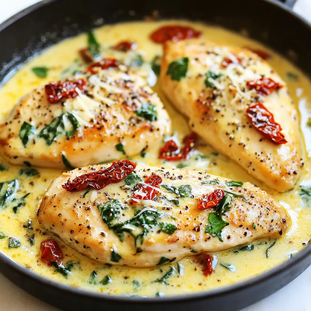 • Return the cooked chicken to the skillet, coating it in the creamy sauce. Let it simmer for another 2 minutes to heat through.