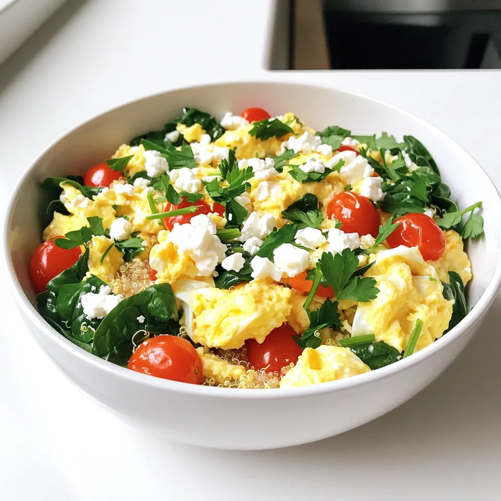 Each ingredient in this bowl brings unique benefits. Egg whites are low in calories and high in protein. They help build muscle and keep you full. Spinach is rich in vitamins and minerals. It adds iron and fiber, which are great for your health. Cherry tomatoes are juicy and sweet. They contain antioxidants that help fight disease. Red bell peppers add a nice crunch. They are high in vitamin C, boosting your immune system. Feta cheese gives a wonderful flavor and some calcium. Quinoa is a complete protein that also brings fiber. Lastly, fresh parsley adds vitamins and brightens the dish.