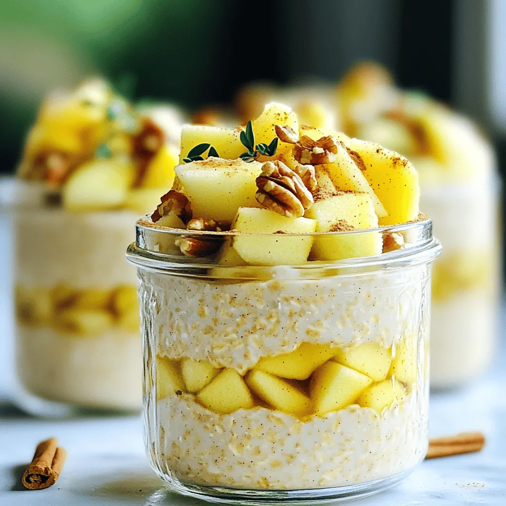 - 1 cup rolled oats - 2 cups almond milk (or any milk of choice) - 2 tablespoons pure maple syrup - 1 teaspoon ground cinnamon - 1/2 teaspoon vanilla extract - 1/4 cup Greek yogurt (optional for creaminess) To make maple cinnamon overnight oats, gather the main ingredients. You need rolled oats, almond milk, and maple syrup. Rolled oats give the dish a good texture. Almond milk makes it creamy and dairy-free. For sweetness, pure maple syrup shines. Ground cinnamon adds warmth and flavor. A splash of vanilla extract enhances the taste. If you like creaminess, add Greek yogurt. These ingredients blend well together. They soak overnight to create a smooth and tasty meal. You can top your oats with diced apple and chopped nuts for crunch. This not only adds flavor but also makes it visually appealing. - Combine all ingredients in a large mixing bowl. - The ingredients are: - 1 cup rolled oats - 2 cups almond milk (or any milk of choice) - 2 tablespoons pure maple syrup - 1 teaspoon ground cinnamon - 1/2 teaspoon vanilla extract - 1/4 cup Greek yogurt (optional for creaminess) - A pinch of salt - Stir well to combine until smooth. - Divide the mixture into jars or containers. - This recipe makes 2 to 4 servings. - Seal the jars tightly and refrigerate overnight. This step helps the oats soak up flavors and soften. - In the morning, stir the oats before serving. - If the mixture is too thick, add a splash more milk. - Top with diced apple and chopped nuts for extra flavor. - Enjoy your overnight oats chilled or at room temperature! If your oats are too thick, just add a little more milk. This helps make them creamy and smooth. You can use any milk you like, such as almond, oat, or cow's milk. If you want a richer texture, add Greek yogurt. It makes the oats extra creamy and adds some protein too. For toppings, I love using diced apples and chopped nuts. They add great flavor and crunch. Try pecans or walnuts for a nice touch. You can also add berries for a pop of color. When serving, use clear jars to show off the layers. This makes your oats look lovely and inviting. Enjoy them cold or at room temperature for a tasty breakfast! {{image_2}} You can make your maple cinnamon overnight oats even better by adding fruits. Berries are a great choice. They add a burst of color and flavor. You can also use sliced bananas for sweetness. Both options bring new life to the oats. Spices can change the taste too. If you want a warm flavor, try adding nutmeg. It pairs well with cinnamon. For a bit of heat, ginger is a fun choice. Just a pinch can make a big difference in taste. If you need gluten-free options, use gluten-free oats. They work just as well in this recipe. You won’t lose any flavor or texture. For a dairy-free or vegan option, skip the Greek yogurt. Substitute with a plant-based yogurt. You can also use almond milk or coconut milk instead of regular milk. This keeps your oats creamy and tasty without dairy. You can store your maple cinnamon overnight oats in the fridge for up to five days. Use an airtight container to keep them fresh. I suggest using glass jars, as they are easy to clean and reuse. To keep the oats tasty, avoid adding toppings until you are ready to eat. This helps keep the nuts and fruit crunchy. Yes, you can freeze overnight oats! To do this, pack the oats into freezer-safe containers. Leave some space at the top, as they will expand when frozen. When you want to eat them, move the container to the fridge overnight to thaw. You can also microwave them for a few minutes. This way, you can enjoy a quick breakfast anytime! Yes, you can use quick oats. Quick oats cook faster and have a softer texture. They absorb liquid more quickly, so the oats may be mushy. Rolled oats provide a chewy bite. If you prefer quick oats, reduce the soaking time. You can use honey or agave syrup as an alternative. Brown sugar mixed with water also works well. Each sweetener has its own flavor, so try what you like best. Just remember to adjust the amount to suit your taste. To make the recipe nut-free, skip the nuts in the topping. Use seeds like pumpkin or sunflower seeds instead. You can also add extra fruit or coconut for texture. Enjoy your oats without worries about nuts! In this blog post, I shared how to make tasty overnight oats. We covered the main ingredients you need, like oats and almond milk. I provided simple steps to mix, refrigerate, and serve your oats. We also explored tips for adjusting texture and exciting ways to customize flavors. Finally, we talked about storage options to keep your oats fresh. I hope you feel ready to make your own delicious overnight oats and enjoy them every morning!