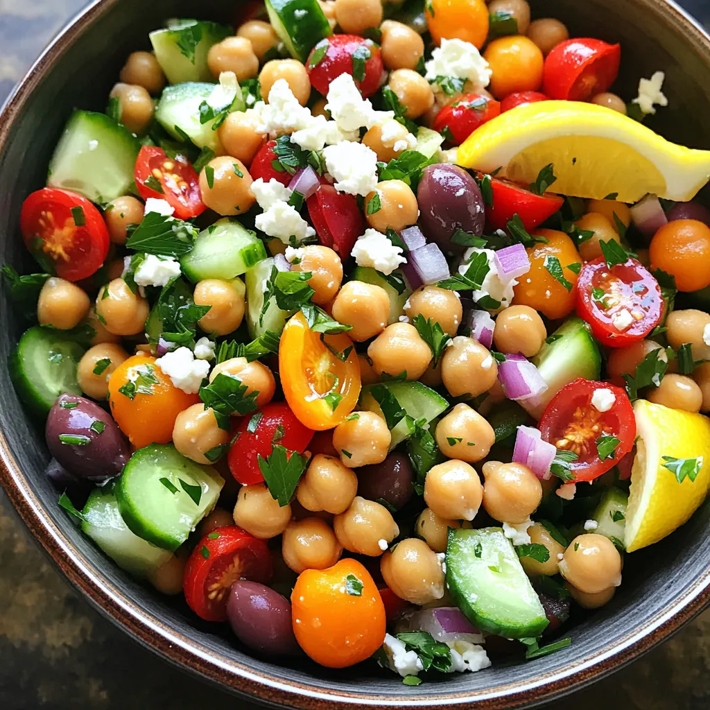 Chickpeas are the star of this dish. They add protein and fiber. The fresh vegetables bring color and crunch. Use ripe cherry tomatoes for sweetness. A crisp cucumber adds a refreshing bite. Bell peppers add a nice, sweet flavor. The olives give a briny taste, while feta cheese adds a creamy texture. Fresh parsley brings a hint of brightness.