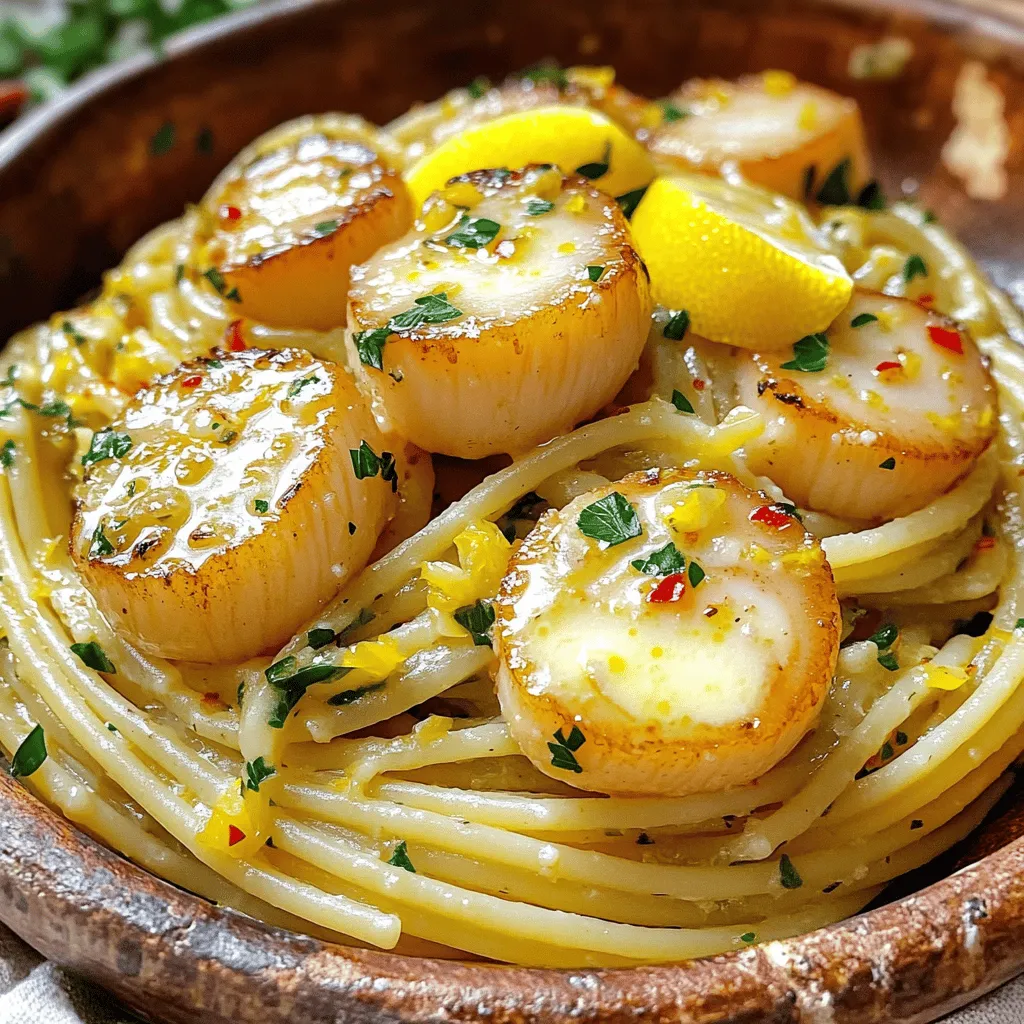 - 8 oz spaghetti or linguine - 1 lb large sea scallops - 4 tablespoons unsalted butter - 4 cloves garlic, minced - 1/4 teaspoon red pepper flakes (optional) - 1/4 cup fresh parsley, chopped - Zest and juice of 1 lemon - Salt and black pepper to taste - Grated Parmesan cheese (for serving, optional) To make Minute Garlic Butter Scallop Pasta, you need just a few key ingredients. First, choose between spaghetti or linguine. Both will coat well with the sauce. Next, grab a pound of large sea scallops. Their sweet flavor shines in this dish. You will also need unsalted butter, which adds richness. Garlic is a must for that savory kick. If you like a bit of heat, add red pepper flakes. They are optional but add a nice touch. For freshness, use chopped parsley and lemon zest. The lemon juice brightens the dish and balances the buttery flavor. Don't forget salt and black pepper to taste. Finally, grated Parmesan cheese is a great way to finish your plate. Gathering these ingredients will set you up for a tasty meal. Each one plays a role in creating a dish that feels fancy yet is easy to make. Start by bringing a large pot of salted water to a boil. This step is crucial for flavor. Add 8 oz of spaghetti or linguine. Cook according to the package instructions until al dente, which is about 8-10 minutes. Once done, reserve 1/2 cup of pasta water for later. Drain the pasta and set it aside. Next, you need to prepare the scallops. Take 1 lb of large sea scallops and pat them dry with paper towels. This helps them sear nicely. Season both sides with salt and black pepper. Make sure to cover them evenly for the best flavor. Now it’s time to sear the scallops. In a large skillet, heat 2 tablespoons of unsalted butter over medium-high heat. When the butter starts to sizzle, gently add the scallops in a single layer. Cook for 2-3 minutes without moving them. This helps to form a golden crust. Flip the scallops and sear for another 2 minutes. Once done, remove them from the skillet and set them aside. In the same skillet, lower the heat to medium. Add the remaining 2 tablespoons of butter and 4 cloves of minced garlic. Sauté for about 1 minute until the garlic is fragrant but not burnt. If you like a little heat, add 1/4 teaspoon of red pepper flakes at this point. Return the cooked scallops to the skillet. Add the drained pasta along with the lemon zest and juice from one lemon. Toss everything gently to combine. If the sauce seems too thick, add a splash of the reserved pasta water. This helps the sauce stick to the pasta. Now for the final touches. Stir in 1/4 cup of chopped fresh parsley. Taste your dish and adjust the seasoning with more salt and black pepper if you want. Cook for another minute to heat everything through. Plate the pasta and make sure each serving gets a good amount of scallops. Garnish with extra parsley and sprinkle with grated Parmesan cheese if you like. Enjoy your meal! To get the best sear on scallops, you must dry them well. Use paper towels to pat them dry before cooking. Wet scallops won’t sear properly; they will steam instead. When the scallops are ready, they will develop a golden crust. Look for that nice color on one side before flipping. Cook them for about 2-3 minutes on the first side and then another 2 minutes on the other side. You can easily boost the flavor of your dish. Consider adding a pinch of fresh herbs like thyme or basil. These will add a lovely aroma and taste. If you want to switch up your pasta, try using fettuccine or penne. Each type will change the dish's texture and mouthfeel. If you're making more or fewer servings, adjust the cooking times slightly. For larger servings, increase the searing time by a minute per batch. For smaller servings, reduce the time to prevent overcooking. Remember, scallops cook quickly. Keep an eye on them to ensure they stay tender and juicy. {{image_2}} You can use shrimp or fish instead of scallops. Shrimp cooks fast and adds a nice flavor. Choose large shrimp for best results. Just sauté them like scallops. For fish, try a firm white fish like cod or halibut. Cut the fish into chunks to cook evenly. This keeps the dish light and tasty. For a vegetarian meal, swap scallops for mushrooms or tofu. Use large portobello mushrooms for a meaty texture. Simply slice and sauté them until golden. Tofu can also work; use firm tofu and press it to remove water. Cut into cubes and pan-fry until crispy. These options keep the dish hearty without seafood. You can make a creamy garlic butter sauce by adding heavy cream. This adds richness and a smooth texture. Start by stirring in about half a cup of cream after cooking garlic. You can also incorporate white wine for extra depth. Just add a splash before the garlic, letting it reduce slightly. Fresh herbs like basil or thyme can brighten the dish. Toss in chopped herbs at the end for fresh flavor. To keep your garlic butter scallop pasta fresh, use airtight containers. Glass or plastic containers work well. Store the leftovers in the fridge for up to three days. Make sure to cool the dish to room temperature before sealing it. This helps keep flavors intact. For the best results, reheat your pasta and scallops on the stove. Add a splash of water or broth to a skillet. Heat over low to medium heat. Stir gently until warmed through. This keeps the pasta from drying out. You can also use the microwave. Heat in short bursts, stirring in between, until hot. If you want to freeze the dish, first let it cool completely. Then, place portions in freezer-safe bags or containers. Remove as much air as possible before sealing. You can freeze it for up to two months. When ready to eat, thaw it overnight in the fridge. Reheat it on the stove as mentioned above. Avoid refreezing after thawing. This dish is quick and easy to prepare. You will spend about 10 minutes getting ready. Cooking the pasta takes another 8-10 minutes. Searing the scallops and making the sauce takes around 5-7 minutes