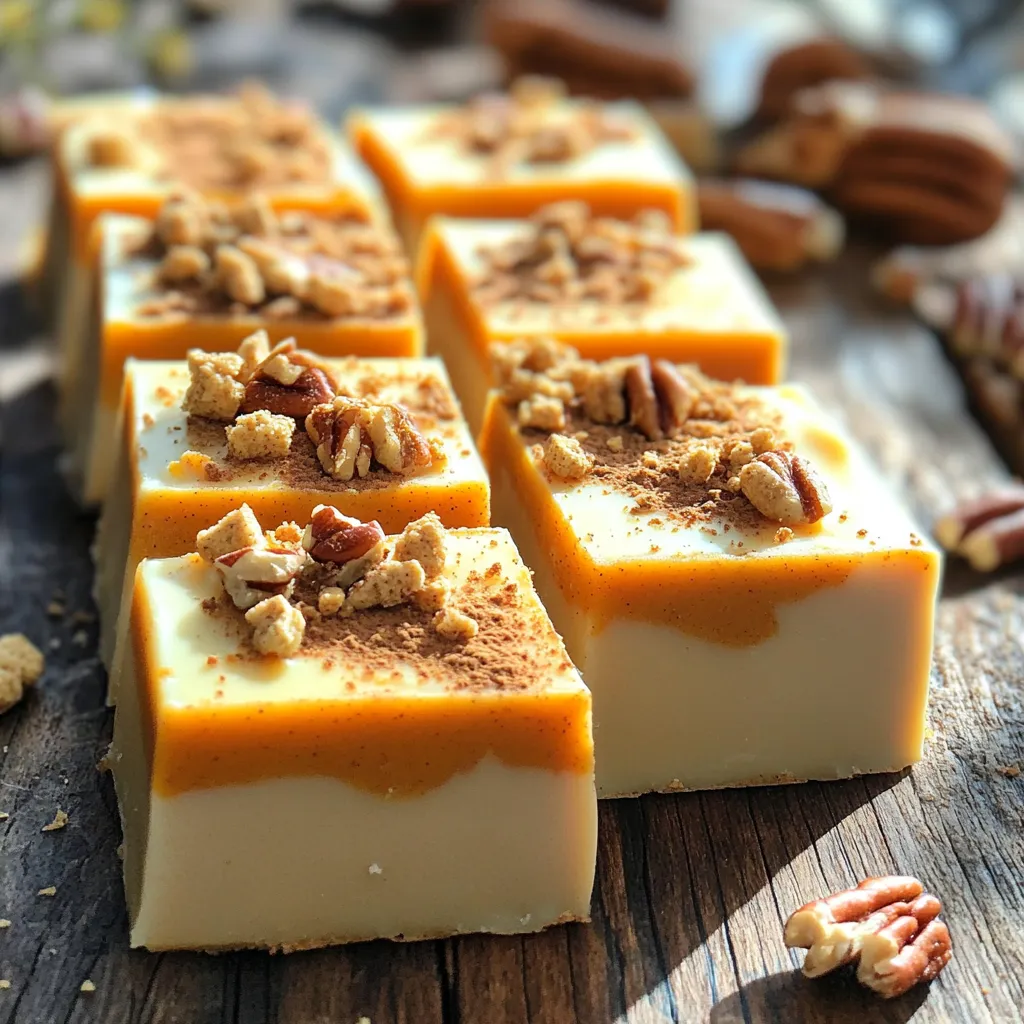 - 1 cup pumpkin puree - 2 cups white chocolate chips - 1 cup sweetened condensed milk - 1 teaspoon vanilla extract - 1 teaspoon pumpkin pie spice - 1/4 teaspoon salt The main ingredients bring rich flavor and creamy texture. Pumpkin puree adds warmth and moisture. White chocolate chips give sweetness and a smooth finish. Sweetened condensed milk binds the mix together. Vanilla extract adds depth, while pumpkin pie spice gives that classic fall taste. A pinch of salt balances the sweetness. - 1/2 cup crushed graham crackers - Chopped pecans or walnuts for garnish You can add crushed graham crackers for crunch. They bring a delightful texture contrast to the creamy fudge. Chopped nuts, like pecans or walnuts, make a nice topping. They add a bit of chew and extra flavor. Plus, they look great on top! First, grab a medium microwave-safe bowl. In this bowl, combine 2 cups of white chocolate chips and 1 cup of sweetened condensed milk. This mix is key for smooth fudge. Microwave it in 30-second bursts. Stir the mixture after each burst. This will help it melt evenly. It will take about 1 to 2 minutes until smooth and creamy. Once the chocolate is melted, it's time to add flavor. Stir in 1 cup of pumpkin puree, 1 teaspoon of vanilla extract, 1 teaspoon of pumpkin pie spice, and 1/4 teaspoon of salt. Mix until everything is well combined. If you want some crunch, fold in 1/2 cup of crushed graham crackers. This step adds a fun texture! Next, prepare your baking dish. Line an 8x8-inch square dish with parchment paper. Leave some paper hanging over the sides. This makes it easy to lift the fudge out later. Pour the fudge mixture into the dish. Use a spatula to spread it out evenly. Make sure the top is smooth. Now it’s time for the fudge to set. Place the dish in the fridge for at least 4 hours. This time helps the fudge firm up. To check if it's ready, gently press the top with your finger. If it feels firm, it’s ready to eat. Enjoy your delicious no-bake fudge! To make smooth fudge, you need to avoid lumps in the mixture. Start by melting the white chocolate chips and sweetened condensed milk together. Microwave them in 30-second bursts. Stir well between each burst. This method helps ensure the chocolate is fully melted. Once melted, your mixture should be smooth and creamy. You can add fun flavor variations to your fudge. Try mixing in spices like cinnamon or nutmeg for a warm taste. You can also add extracts like almond or maple for a unique twist. If you enjoy nuts, consider folding in chopped pecans or walnuts. They add a nice crunch and flavor to the fudge. To make your fudge look great, you can garnish it with chopped nuts on top. This adds a nice touch both in taste and appearance. For serving, cut the fudge into small squares. Arrange them on a pretty plate. You can even wrap them in cute packaging for gifts. This makes your fudge not just tasty, but also visually appealing! {{image_2}} You can easily switch up the flavor of this fudge. Try adding maple syrup for a sweet twist. Mix in a teaspoon of cinnamon for a warm spice note. If you love chocolate, swap some white chocolate chips for semi-sweet ones. This gives a rich, deep flavor to your fudge. Want to make this fudge vegan? Use dairy-free white chocolate chips and coconut milk. You can find these at most grocery stores. For a gluten-free treat, skip the graham crackers or use gluten-free ones. This way, everyone can enjoy this tasty fudge. Fall is the perfect time to add other seasonal flavors. Try mixing in caramel for extra sweetness. You can also add chopped apples for a fruity crunch. These additions make your fudge even more special and festive. To keep your fudge fresh, use an airtight container. A glass or plastic container works well. Make sure the fudge is fully cooled before storing. Keep it in the fridge. This helps it stay firm and tasty. This fudge can stay fresh for about 1 to 2 weeks. If you see any signs of mold, or if it smells off, toss it out. Fudge can dry out over time, so check for any hard edges or cracks. To freeze the fudge, cut it into squares and wrap each piece tightly in plastic wrap. Place them in a freezer-safe bag or container. This way, you can enjoy it later! When you're ready to eat it, thaw the fudge in the fridge overnight for the best texture. Don't rush it by using heat. This keeps the creaminess intact. Yes, you can use milk chocolate. It will change the taste and color of the fudge. Milk chocolate adds a creamier and sweeter flavor. However, it may not blend as well with pumpkin. The fudge will also be darker. White chocolate provides a nice contrast with the pumpkin. To make this fudge vegan, substitute a few key ingredients. Use dark chocolate chips or dairy-free white chocolate. Replace sweetened condensed milk with coconut milk and a bit of sugar. You can also skip the butter for a plant-based option. These swaps help keep the fudge creamy and tasty. Yes, you can. Try using mashed banana or applesauce for a fruity twist. These alternatives will change the flavor but still provide moisture. You could also use butternut squash puree for a similar taste. Just remember, the texture may differ a bit from the original recipe. This blog post covered all you need for making delicious pumpkin fudge. You learned about key and optional ingredients, easy instructions, and helpful tips. Customize your fudge with flavors and nuts, and explore seasonal ingredients. Remember to store your fudge properly to enjoy it longer. With these steps and ideas, you'll create a treat that everyone will love. Dive in and make your perfect batch today!