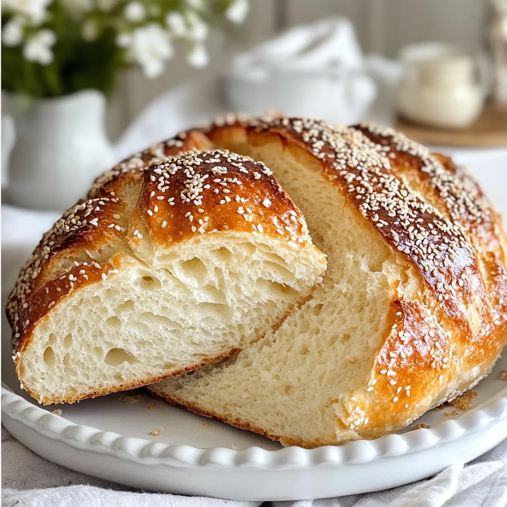 - 3 cups all-purpose flour - 1 ½ teaspoons salt - ½ teaspoon instant yeast - 1 ½ cups warm water (about 110°F or 43°C) - Optional: 1 tablespoon honey or sugar for slight sweetness - Optional: ¼ cup seeds (like sesame or sunflower) for added texture To make great no-knead bread, you need a few key ingredients. Each ingredient plays a role. Flour is the backbone of your bread. All-purpose flour gives it structure and chew. Salt adds flavor and controls yeast activity. It also helps to strengthen the dough. Instant yeast is a fast-acting yeast. It helps the dough rise without waiting too long. Warm water activates the yeast. Make sure it's not too hot or cold. You can add honey or sugar for a touch of sweetness. It works well with savory or sweet breads. Seeds like sesame or sunflower can give your bread a nice crunch. When choosing flour, look for unbleached all-purpose flour. It has a better flavor. Always check the expiration date on your yeast. Fresh yeast helps the dough rise well. Use clean, filtered water for the best results. This affects the dough's taste. If you choose seeds, go for whole seeds. They add great texture and flavor. These choices make your no-knead bread taste even better. Enjoy the process of selecting and using these ingredients! {{ingredient_image_1}} 1. Start by gathering your ingredients. You need 3 cups of all-purpose flour, 1 ½ teaspoons of salt, and ½ teaspoon of instant yeast. 2. In a large bowl, combine the flour, salt, and yeast. Stir them together until they mix well. 3. Next, pour in 1 ½ cups of warm water. The water should be about 110°F or 43°C. 4. Use a wooden spoon or spatula to mix the water with the dry ingredients. You want a shaggy dough, so don’t overmix. 5. If you like a hint of sweetness, add 1 tablespoon of honey or sugar to the dough now. 6. For added texture, fold in ¼ cup of seeds like sesame or sunflower at this stage. 1. Cover the bowl with plastic wrap or a clean kitchen towel. Let it sit at room temperature for 12 to 18 hours. 2. During this time, the dough will bubble and rise. This is a sign that it's ready. 3. After rising, lightly flour a clean surface. Turn the sticky dough out onto it. 4. Use floured hands to gently shape the dough into a ball. Be careful not to deflate it too much. 5. Let the dough rest for about 30 minutes while your Dutch oven heats up. 1. Preheat your oven to 450°F (232°C). Place the Dutch oven (with the lid on) inside to heat up for 30 minutes. 2. Once it’s hot, carefully remove the Dutch oven. Lift the lid, watching out for steam. 3. Quickly transfer the shaped dough into the pot. If you want easier removal, line the pot with parchment paper. 4. Cover the Dutch oven with the lid and bake for 30 minutes. 5. After 30 minutes, remove the lid and bake for an extra 15 to 20 minutes. You want the bread to turn golden and crusty. 6. Once baked, carefully take the bread out of the Dutch oven. Let it cool on a wire rack for at least an hour before slicing. Overmixing the dough Mixing your dough too much can harm the bread. You want a shaggy texture, not a smooth one. Mix just until all the flour is wet. This helps keep air in, making the bread light and fluffy. Incorrect rising conditions The right temperature for rising is crucial. Your dough needs warmth, around 70°F to 80°F. If your kitchen is too cold, the bread may not rise well. Find a warm spot, like near an oven or on a sunny counter. Tips on steam and temperature control Steam helps form a nice crust. When you bake in a Dutch oven, the lid traps steam. This creates a crisp crust. Keep the lid on for the first 30 minutes. Then, remove it to brown the top. Using parchment paper vs. directly placing dough in the pot Using parchment paper can make it easy to lift the bread out. It also helps prevent sticking. If you do not use it, be sure to lightly flour the pot before placing the dough inside. Experimenting with add-ins Add-ins can change the bread’s flavor and texture. Try seeds like sesame or sunflower for crunch. Herbs can add a fresh taste. Just remember to keep the dough’s balance. Adjustments for different flour types You can use whole wheat or bread flour. Each type changes the texture. Whole wheat makes it denser. Bread flour can create a chewier crust. Adjust water as needed for different flours. Pro Tips Use a Kitchen Scale: For the most accurate measurements, consider weighing your flour instead of using cups. 1 cup of all-purpose flour typically weighs about 120 grams. Longer Rise for Enhanced Flavor: If you have the time, allowing the dough to rise for up to 24 hours will develop a richer flavor and a more complex texture. Experiment with Flours: While all-purpose flour works great, try mixing in whole wheat flour or bread flour for a different texture and flavor profile. Cooling Is Key: Resist the temptation to slice the bread right out of the oven. Let it cool completely on a wire rack to ensure a better crumb structure. {{image_2}} You can make your no-knead bread even better. Adding herbs and spices can boost the taste. Here are some ideas: - Rosemary: A classic choice that adds a piney flavor. - Thyme: This herb gives a warm, earthy taste. - Garlic powder: A little can bring a bold punch. - Dried basil: Adds a sweet, aromatic touch. Seeds and nuts can also add a nice crunch. You might try: - Sunflower seeds: These add a nutty flavor and texture. - Sesame seeds: Great for a slight nutty taste and visual appeal. - Chopped walnuts: They give a rich, hearty bite. Mix and match these ingredients to craft your unique bread! You can sweeten your bread with different options. Honey and sugar both work well, but they change the taste. - Honey: This adds a floral note, making the bread a bit richer. - Sugar: A classic choice that gives a neutral sweetness. If you want natural sweeteners, consider: - Maple syrup: This brings a deep, warm flavor. - Agave nectar: A lighter, milder option that dissolves easily. Using these sweetene