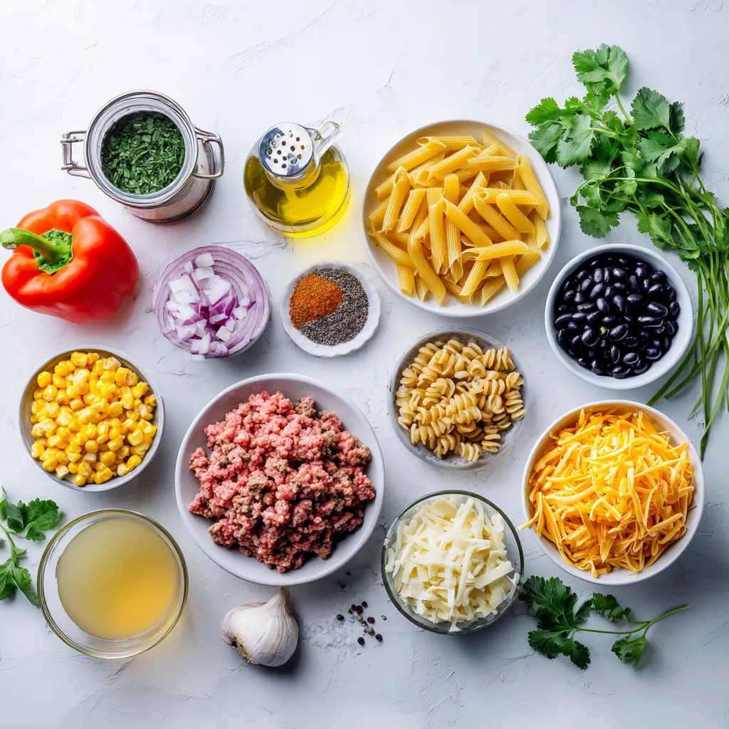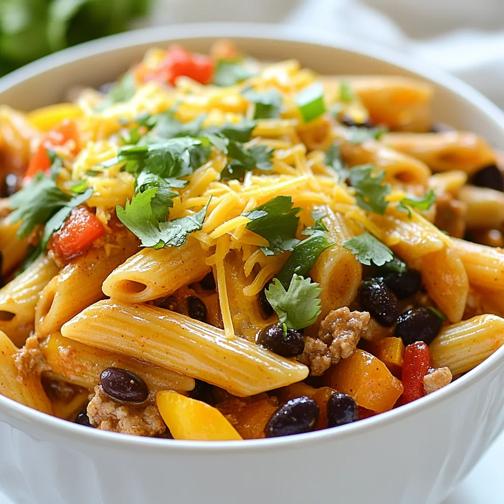 To make One Pot Taco Pasta, gather these must-have items: - 1 pound ground turkey or beef - 1 onion, diced - 2 cloves garlic, minced - 1 bell pepper, diced (any color) - 1 tablespoon taco seasoning - 1 can (15 oz) black beans, drained and rinsed - 1 cup corn kernels (fresh or frozen) - 3 cups chicken broth - 12 oz penne pasta or fusilli - 1 cup diced tomatoes (canned or fresh) - 1 cup shredded cheddar cheese - 1 tablespoon olive oil - Fresh cilantro, for garnish - Salt and pepper to taste You can switch things up with these fun options: - Use ground chicken or tofu instead of turkey or beef. - Add jalapeños for extra heat. - Include zucchini or spinach for more veggies. - Swap cheddar for a different cheese like pepper jack or mozzarella. - Use different beans, like pinto or kidney beans. When picking your ingredients, I suggest: - Ground Meat: Look for brands like Perdue for turkey or grass-fed beef from local farms. - Taco Seasoning: McCormick offers a great blend with rich flavors. - Canned Tomatoes: Hunt's diced tomatoes are ripe and tasty. - Cheese: Tillamook's cheddar melts perfectly and adds great flavor. - Olive Oil: Extra virgin olive oil from California gives the best taste. With these ingredients, you will create a tasty and quick meal that everyone will love! {{ingredient_image_1}} To start, gather all your ingredients. This makes cooking easier. Here’s what you need: - 1 pound ground turkey or beef - 1 onion, diced - 2 cloves garlic, minced - 1 bell pepper, diced (any color) - 1 tablespoon taco seasoning - 1 can (15 oz) black beans, drained and rinsed - 1 cup corn kernels (fresh or frozen) - 3 cups chicken broth - 12 oz penne pasta or fusilli - 1 cup diced tomatoes (canned or fresh) - 1 cup shredded cheddar cheese - 1 tablespoon olive oil - Fresh cilantro, for garnish - Salt and pepper to taste Next, chop your onion and bell pepper. Mince the garlic. These steps help build flavor. Now, let’s cook! Heat the olive oil in a large pot over medium heat. Add the diced onion and bell pepper. Cook them for about 4-5 minutes, until they soften. Then, stir in the minced garlic. Cook for another minute until you smell that great garlic aroma. Now it's time to add the meat. Put in your ground turkey or beef. Break it apart with a spatula. Cook it for about 5-7 minutes, until it turns brown. Sprinkle in your taco seasoning. Mix it well with the meat and veggies. Next, pour in the chicken broth, diced tomatoes, black beans, corn, and uncooked pasta. Stir everything together. Bring the mixture to a boil. Then, reduce the heat to low. Cover the pot and let it simmer for 10-12 minutes. Stir occasionally to keep the pasta from sticking. Once the pasta is tender, take it off the heat. Stir in the shredded cheddar cheese until it melts and gets creamy. Season with salt and pepper to taste. Finally, serve hot and garnish with fresh cilantro for color and flavor. To make sure your pasta turns out great, follow these tips: - Use enough liquid. The pasta needs it to cook well. - Stir often during simmering. This helps prevent sticking. - Check for doneness. Pasta should be tender but not mushy. These simple steps will help you make the best One Pot Taco Pasta every time! Cooking in one pot saves time and energy. Start by prepping all your ingredients first. This way, you can add them in the right order. Use a large pot to give everything room to cook. Heat the olive oil well before adding your onion and pepper. This helps them soften quickly. Stir often to keep food from sticking to the bottom. If you see any bits stuck, give it a good scrape with your spatula. This adds extra flavor to your dish. Ensure you cover the pot after adding liquids. It traps heat and cooks the pasta evenly. To adjust the seasoning, taste as you cook. Start with the taco seasoning and add more if needed. If you want it spicier, add a pinch of cayenne pepper or chopped jalapeños. For a milder taste, reduce the seasoning or skip it. You can also add a dollop of sour cream or a splash of lime juice. These add flavor without heat. Remember, every ingredient has its own flavor. Black beans and corn add sweetness, while tomatoes add acidity. Balancing these flavors is key to a tasty dish. One common mistake is overcooking the pasta. Follow the cooking time closely. Stir often to prevent it from sticking. Another mistake is not seasoning enough. Taste as you go to find the right balance. Don’t forget to use enough liquid. If it looks dry, add a little more broth or water. Finally, avoid adding cheese too early. Stir it in after cooking for a creamy texture. These tips will help you make a perfect one pot taco pasta that everyone will love. Pro Tips Customize Your Protein: Feel free to swap out ground turkey or beef for ground chicken, pork, or even plant-based meat alternatives for a healthier or vegetarian version. Boost the Flavor: Adding a splash of lime juice or a few chopped jalapeños can enhance the flavor profile and add a delightful kick to the dish. Cheese Variations: Experiment with different types of cheese, such as pepper jack for a spicy twist or mozzarella for a milder flavor, to suit your taste preferences. One-Pot Cooking Tip: To prevent pasta from sticking, stir the mixture occasionally while it simmers, and ensure there's enough liquid for the pasta to absorb. {{image_2}} You can easily make this dish vegetarian or vegan. Instead of meat, use mushrooms or lentils. Both options add great texture and flavor. Use vegetable broth instead of chicken broth for a vegan base. You can also add more beans, like kidney beans or chickpeas, for extra protein. Swap out the cheese for a vegan alternative or skip it entirely for a lighter meal. If you want to cater to different diets, swap out a few ingredients. For gluten-free pasta, use rice or quinoa pasta. Instead of corn, use diced zucchini or chopped spinach for a veggie boost. If you're watching your sodium, choose low-sodium broth and canned tomatoes. You can 