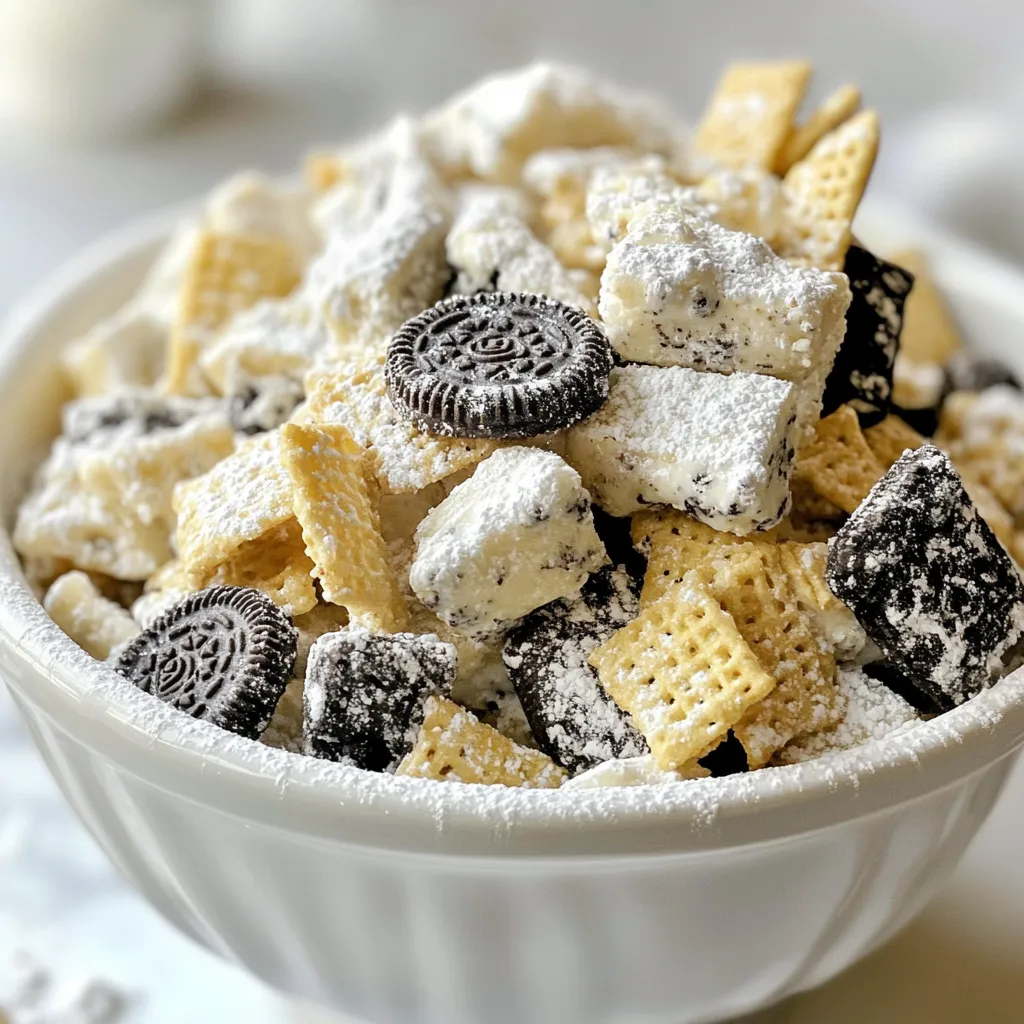 A delicious mix of Ritz crackers, Oreo cookies, and Chex cereal coated in a creamy white chocolate and peanut butter mixture, finished with powdered sugar.