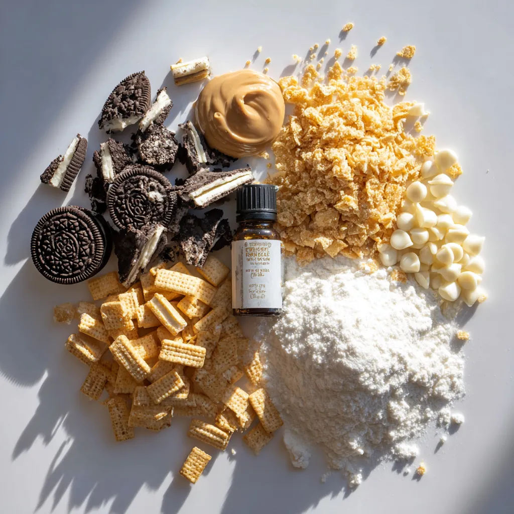 Each ingredient plays a key role. The Ritz crackers add a salty crunch. Oreo cookies bring sweetness and creaminess. Chex cereal adds a light texture. White chocolate chips melt into a smooth coating. Peanut butter adds rich flavor. Vanilla extract enhances the taste. Finally, powdered sugar gives a sweet finish.