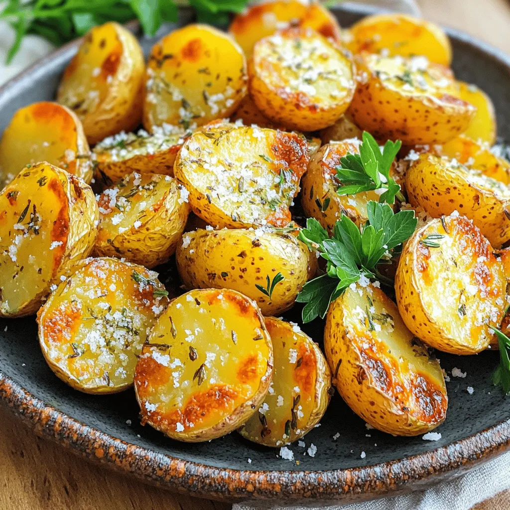 To make Parmesan Herb Roasted Potatoes, gather these simple ingredients: - 2 pounds baby potatoes, halved - 1/4 cup grated Parmesan cheese - 3 tablespoons olive oil - 2 teaspoons garlic powder - 1 teaspoon dried thyme - 1 teaspoon dried rosemary - 1 teaspoon smoked paprika - Salt and pepper to taste - Fresh parsley, chopped (for garnish) Each ingredient plays a key role. The baby potatoes provide a creamy inside and crispy skin. Parmesan cheese adds a salty, nutty flavor that pairs well with herbs. Olive oil helps everything crisp up in the oven. Garlic powder, thyme, rosemary, and smoked paprika bring warmth and depth. Salt and pepper enhance all these flavors. Finally, fresh parsley adds color and freshness when you serve the dish. With these ingredients, you create a tasty side dish that everyone will love! - Set temperature to 425°F (220°C). - Prepare a baking sheet with parchment paper. Preheating the oven helps cook the potatoes evenly. Lining the sheet makes cleanup easy. - Combine 2 pounds of halved baby potatoes and seasonings in a mixing bowl. - Add 3 tablespoons of olive oil, 2 teaspoons of garlic powder, 1 teaspoon of dried thyme, 1 teaspoon of dried rosemary, 1 teaspoon of smoked paprika, and salt and pepper to taste. Toss to coat evenly. Mixing the potatoes with the seasonings ensures every bite is full of flavor. The olive oil helps the spices stick and adds crispiness. - Spread the seasoned potatoes on the baking sheet in a single layer, cut side down. - Roast the potatoes in the preheated oven for about 25 minutes, or until they start to soften. - After 25 minutes, remove them from the oven and sprinkle 1/4 cup of grated Parmesan cheese evenly over the top. - Return the potatoes to the oven for an additional 10-15 minutes, or until they are golden brown and crispy on the edges. This roasting method brings out the best in the potatoes. The cheese adds a tasty topping that melts and crisps up nicely. To get the best crunch, always place the cut side down. This lets the flat surface touch the hot pan. Roasting techniques matter too. Start with high heat. The heat quickly crisps the edges. Check your potatoes halfway through and flip them if needed. For the best results, use baby potatoes. They cook evenly and have a great texture. Red or yellow baby potatoes work well. Size matters too. Keep them similar in size for even cooking. Larger pieces take longer, while smaller ones cook faster. Fresh herbs make a big difference. Try adding some chopped rosemary or thyme. They add a bright taste. You can also mix in spices. Crushed red pepper adds heat, while smoked paprika gives a nice depth. Adjust these to your liking for a unique touch. {{image_2}} You can make these potatoes even tastier by adding fresh minced garlic. Just chop a few cloves and mix them in with your potatoes and seasonings. This adds a nice, rich flavor. You can also try using different herbs. Fresh parsley, basil, or oregano can give your dish a unique twist. Each herb brings its own taste, so feel free to mix and match! If you love cheese, consider adding more! You can use mozzarella for a gooey texture or cheddar for a sharp flavor. Sprinkle some cheese on top just before serving for a fun finish. You can also add crispy bacon bits or green onions as toppings. These extras create a loaded potato experience that is sure to impress! For those who like heat, add crushed red pepper flakes to the seasoning mix. This will give your potatoes a nice kick. You can also try other spicy seasonings like chili powder or cayenne pepper. These spices blend well with the Parmesan and herbs, making every bite exciting. Adjust the spice level to your taste for a perfect fit! To reheat your Parmesan herb roasted potatoes, use the oven. Preheat it to 350°F (175°C). Spread the potatoes on a baking sheet. Heat for about 10-15 minutes. This method keeps them crispy. Avoid using the microwave. It can make them soggy and soft. You can freeze roasted potatoes for later use. Let them cool completely first. Place them in an airtight container or a freezer bag. Remove as much air as possible. When ready to eat, thaw in the fridge overnight. Reheat in the oven for best results. This helps keep their flavor and texture. In the fridge, roasted potatoes last about 3-5 days. Store them in an airtight container. Check for signs of spoilage. If they smell bad or look slimy, throw them away. Freshness is key for great taste! Yes, you can use other cheeses. Some great options include: - Pecorino Romano - Grana Padano - Nutritional yeast (for a vegan option) Each cheese brings a unique flavor. Pecorino is saltier and sharper. Grana Padano is milder and creamier. Nutritional yeast adds a cheesy flavor without dairy. To make this dish vegan, you can substitute: - Use nutritional yeast for cheese. - Swap olive oil with avocado oil or coconut oil. You can also add a splash of lemon juice for brightness. Keep the seasonings the same for full flavor. Yes, you can prep these potatoes ahead. Here’s how: - Cook and cool the potatoes before storing. - Place them in an airtight container in the fridge for up to three days. To reheat: - Use the oven at 350°F (175°C) for about 10–15 minutes. - For extra crispiness, broil for a minute or two at the end. You now have a delicious recipe for Parmesan Herb Roasted Potatoes. We covered the ingredients, step-by-step instructions, and useful tips. You can try variations to change the flavor. Remember, the right type of potato makes a big difference. If you have leftovers, proper storage keeps them tasty. Explore your options and enjoy making this dish your own! Happy cooking!