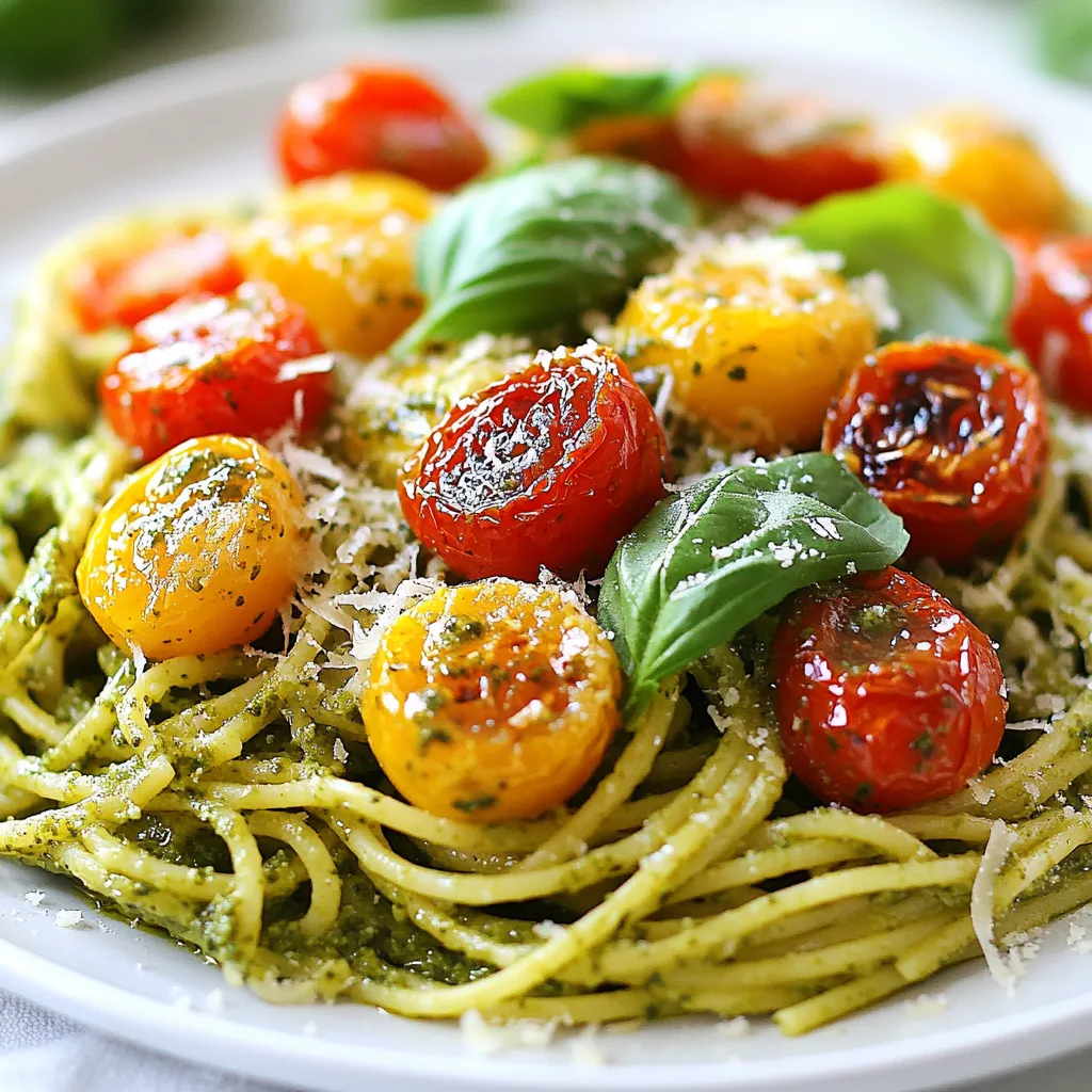 - 8 oz (225 g) spaghetti or your preferred pasta - 1 cup cherry tomatoes, halved - 1 cup basil pesto (store-bought or homemade) - 2 tablespoons olive oil - 1 teaspoon balsamic vinegar - Salt and pepper to taste - ½ cup grated Parmesan cheese (plus extra for serving) - Fresh basil leaves for garnish The main ingredients bring a lot of flavor to the dish. The pasta serves as a base. The cherry tomatoes add a sweet burst when roasted. Pesto provides that herby richness, while Parmesan gives a salty kick. - Crushed red pepper flakes - Pine nuts or walnuts for crunch - Lemon zest for brightness Using optional ingredients can make your dish more exciting. A sprinkle of red pepper flakes adds heat. Nuts give a nice texture. Lemon zest brightens up the flavors and balances the richness. - Baking sheet for roasting tomatoes - Large pot for boiling pasta - Wooden spoon for mixing - Colander for draining pasta Having the right tools makes cooking easier. A baking sheet is perfect for roasting. A large pot helps cook the pasta evenly. A colander lets you drain the pasta without making a mess. {{ingredient_image_1}} First, preheat your oven to 400°F (200°C). This temperature gets the tomatoes nice and juicy. Next, take 1 cup of halved cherry tomatoes. Toss them with 1 tablespoon of olive oil, salt, and pepper on a baking sheet. Spread them out evenly. Roast in the oven for 15-20 minutes. You want them blistered and caramelized for the best flavor. While the tomatoes roast, fill a large pot with salted water. Bring it to a boil. Add 8 ounces of spaghetti or your favorite pasta. Cook as the package says, usually 8-10 minutes. You want it al dente, which means tender but still firm. After cooking, save ½ cup of the pasta water. Drain the rest and put the pasta back in the pot. Now, stir in 1 cup of basil pesto with the pasta. Add the remaining tablespoon of olive oil and 1 teaspoon of balsamic vinegar. Mix well until every strand is coated. If it feels dry, slowly add some of the reserved pasta water. Gently fold in the roasted tomatoes. Sprinkle in ½ cup of grated Parmesan cheese and mix. Taste and add more salt and pepper if needed. Serve hot for the best taste. Top with extra Parmesan cheese and fresh basil leaves for a nice finish. This dish looks great and tastes even better. Enjoy your flavorful meal! Choosing great tomatoes makes a big difference. Look for cherry tomatoes that feel firm and heavy. Their color should be bright and shiny. Avoid any that feel soft or have dark spots. Fresh tomatoes are sweet and juicy, which works well with pesto and pasta. You can use store-bought pesto for quick meals. It saves time and still tastes good. However, making homemade pesto gives you control over flavors. Use fresh basil, garlic, nuts, and cheese to create your own mix. You can adjust the taste to your liking. Both options work well with roasted tomatoes. To cook pasta perfectly, use a large pot with plenty of water. Add salt once the water boils; it helps flavor the pasta. Cook until al dente, which means it should be firm but not hard. Save some pasta water to help mix with your sauce later. This extra step makes your dish creamy and delicious. Pro Tips Use Fresh Basil: For the best flavor, use fresh basil in your pesto. It enhances the aroma and taste of the dish significantly. Customize Your Pasta: Feel free to substitute spaghetti with any pasta shape you prefer, such as penne or fusilli, for a different texture. Add Protein: For a heartier meal, consider adding grilled chicken, shrimp, or chickpeas to your pasta for extra protein. Don't Skip the Pasta Water: The reserved pasta cooking water helps to create a silky sauce. Add it gradually for the perfect consistency. {{image_2}} You can mix different veggies into your pesto pasta. Try adding spinach for extra greens. Zucchini adds a nice crunch. Bell peppers give a sweet taste. You can also toss in peas for a pop of color and flavor. Just roast them or sauté them lightly before mixing. This makes your dish colorful and healthy. For protein, consider adding cooked chicken or shrimp. Grilled chicken gives a great smoky taste. Shrimp cooks quickly and absorbs the pesto flavor well. You can also use beans like chickpeas for a plant-based option. They add protein and fiber without meat. Just fold them in with the pasta and tomatoes. If you need gluten-free pasta, use rice or chickpea pasta. They taste great with pesto. For a low-carb choice, try zucchini noodles, known as zoodles. They are light and soak up flavors well. Just spiralize your zucchini and sauté it for a few minutes. This will give you a tasty, low-carb meal. After enjoying your pesto pasta with roasted tomatoes, store leftovers in an airtight container. Let the pasta cool to room temperature first. Then, place it in the fridge. It will stay fresh for about three days. If you need to store it longer, consider freezing it. To reheat your pasta, place it in a pot over low heat. Add a splash of water or olive oil to keep it moist. Stir gently until warmed through. You can also microwave it in a bowl. Cover it with a microwave-safe lid. Heat for one minute, stir, and heat again if needed. To freeze pesto pasta, follow these steps: - Cool the pasta completely. - Portion it into freezer-safe bags. - Squeeze out excess air before sealing. - Label the bags with the date. You can freeze it for up to three months. To enjoy, thaw it in the fridge overnight before reheating. I love using spaghetti for this dish. It captures the sauce well. You can also use penne, fusilli, or any pasta you like. Just make sure it cooks al dente, so it holds its shape. Yes, you can make this dish vegan! Simply swap the Parmesan cheese with a vegan option. You can also use nutritional yeast for a cheesy flavor. Check the pesto ingredients too, as some brands add cheese. Roasted tomatoes taste best fresh. If you have leftovers, store them in the fridge. They will last for about 3 to 5 days in an airtight container