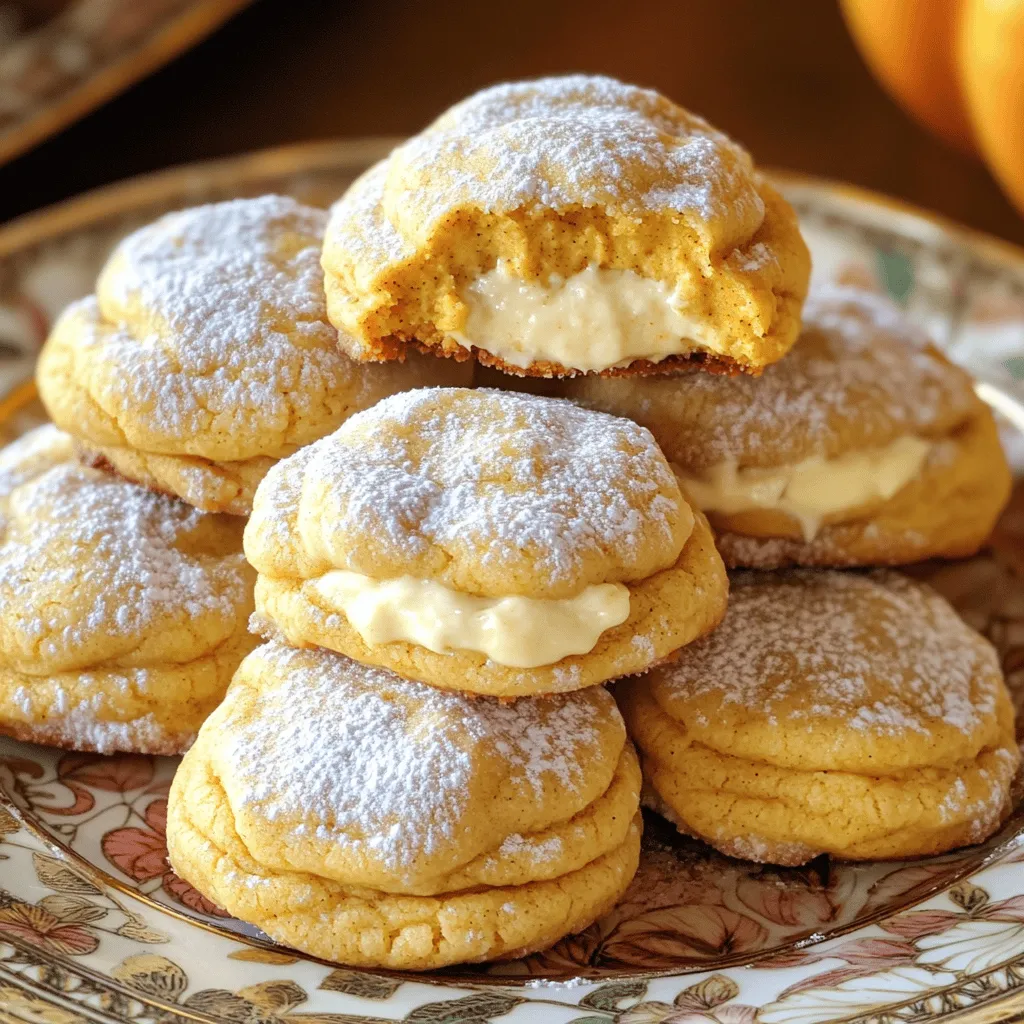 - Butter and Sugars - 1 cup unsalted butter, softened - 1 cup brown sugar, packed - 1/2 cup granulated sugar - Egg and Vanilla Extract - 1 large egg - 1 teaspoon vanilla extract - Dry Ingredients - 3 cups all-purpose flour - 1 teaspoon baking soda - 1 teaspoon ground cinnamon - 1/2 teaspoon ground nutmeg - 1/4 teaspoon ground ginger - 1/2 teaspoon salt - Pumpkin Cheesecake Filling Components - 1 cup pumpkin puree - 8 oz cream cheese, softened - 1/4 cup powdered sugar - 1 teaspoon vanilla extract These ingredients blend perfectly to create a soft and chewy cookie with a creamy, pumpkin cheesecake center. Each bite bursts with flavors of fall. You'll love how easy it is to gather these basics. Make sure your butter is soft; it helps in getting that light and fluffy texture. The spices add warmth, making these cookies feel like a cozy hug. The pumpkin puree brings moisture and a hint of sweetness, while the cream cheese filling creates a rich, creamy contrast. Enjoy the fun of mixing these ingredients together! 1. Preheat the Oven and Prepare Baking Sheet Start by preheating your oven to 350°F (175°C). This step is key for even baking. Line a baking sheet with parchment paper to keep cookies from sticking. 2. Creaming Butter and Sugars In a large bowl, combine 1 cup of softened unsalted butter, 1 cup of brown sugar, and 1/2 cup of granulated sugar. Mix these together until the blend feels light and fluffy. This should take about 2-3 minutes. 3. Incorporating Egg and Vanilla Next, beat in 1 large egg and 1 teaspoon of vanilla extract. Mix until everything is well combined. The mixture should be smooth and creamy. 1. Mixing Dry Ingredients In another bowl, whisk together 3 cups of all-purpose flour, 1 teaspoon of baking soda, 1 teaspoon of ground cinnamon, 1/2 teaspoon of ground nutmeg, 1/4 teaspoon of ground ginger, and 1/2 teaspoon of salt. This mix adds flavor and structure. 2. Combining Wet and Dry Mixtures Gradually add the dry mix into the wet mixture. Stir until a soft dough forms. Don’t overmix; just combine until you don’t see any dry flour. 1. Mixing Pumpkin Puree and Cream Cheese In a separate bowl, mix together 1 cup of pumpkin puree, 8 oz of softened cream cheese, and 1/4 cup of powdered sugar. Add another teaspoon of vanilla extract to enhance the flavor. Mix until smooth and creamy. 1. Shaping and Stuffing the Dough Take about 1 tablespoon of cookie dough and flatten it in your palm. Place 1 teaspoon of the pumpkin cheesecake filling in the center. Enclose it with the dough and roll it into a ball. 2. Placement on Baking Sheet Place the stuffed cookie dough balls onto the prepared baking sheet. Make sure to space them about 2 inches apart to allow for some spreading. 1. Baking Time and Temperature Bake the cookies in the preheated oven for 12-15 minutes. Look for edges that are lightly golden, while the center should remain soft. 2. Cooling and Serving Suggestions Once baked, remove the cookies from the oven. Let them cool on the baking sheet for about 5 minutes. Then, transfer them to a wire rack to cool completely. For serving, stack them on a plate and dust with powdered sugar for a sweet touch. Ensuring Proper Dough Consistency The dough for these cookies should be thick but pliable. If it feels too sticky, add a little more flour. This helps the cookies hold their shape during baking. A good tip is to refrigerate the dough for about 30 minutes. This chill time makes the dough easier to handle and shapes better. Checking for Doneness To know when your cookies are done, look for golden edges. The center should still look soft. This is key to keeping the cookies chewy and tasty. If you overbake them, they can turn hard and lose that perfect texture. Presentation Ideas for Cookies To make these cookies look extra special, stack them on a nice plate. Dust them with powdered sugar for a sweet touch. You can also drizzle a simple glaze made from powdered sugar and water on top. This adds a nice shine and extra flavor. Pairing with Beverages These cookies go well with warm drinks. Try serving them with a cup of coffee or hot chocolate. The flavors blend perfectly. You can also serve them with a glass of cold milk for a fun treat. Enjoying these cookies with a drink makes them even more delightful. {{image_2}} You can take these cookies to the next level with a few simple tweaks. - Adding Chocolate Chips or Nuts: Toss in some chocolate chips for a sweet touch. They add a nice contrast to the pumpkin flavor. Chopped nuts, like walnuts or pecans, give a crunchy texture that pairs well with the soft cookie. Just mix in about 1/2 cup of either before baking. - Alternative Cheesecake Fillings: You don’t have to stick with pumpkin filling. Try using sweetened cream cheese mixed with other flavors. A hint of lemon zest or a splash of maple syrup can change the taste. Use about 1/4 cup of these flavors in the filling for a fresh twist. As the seasons change, so can your cookies. - Adjusting Spices for Different Occasions: You can change the spices to fit the season. For winter, add more nutmeg and cloves for a warm feel. In spring, try lighter spices like cardamom. Just adjust the amounts based on your taste. - Using Sweet Potato or Butternut Squash: If you want a different flavor, swap pumpkin for sweet potato or butternut squash. They both bring a sweet, creamy texture. Use the same amount as pumpkin puree. This keeps the cookie moist and tasty while giving it a new flair. To keep your cookies fresh, store them in an airtight container. This helps maintain their soft texture and rich flavor. Line the container with parchment paper to absorb any moisture. Avoid stacking the cookies directly on top of each other to prevent squishing. If you want to freeze the cookies, first let them cool completely. Then, place them in a single layer on a baking sheet. Freeze them for about an hour until firm. After that, transfer them to a freezer bag, squeezing out as much air as possible. This m