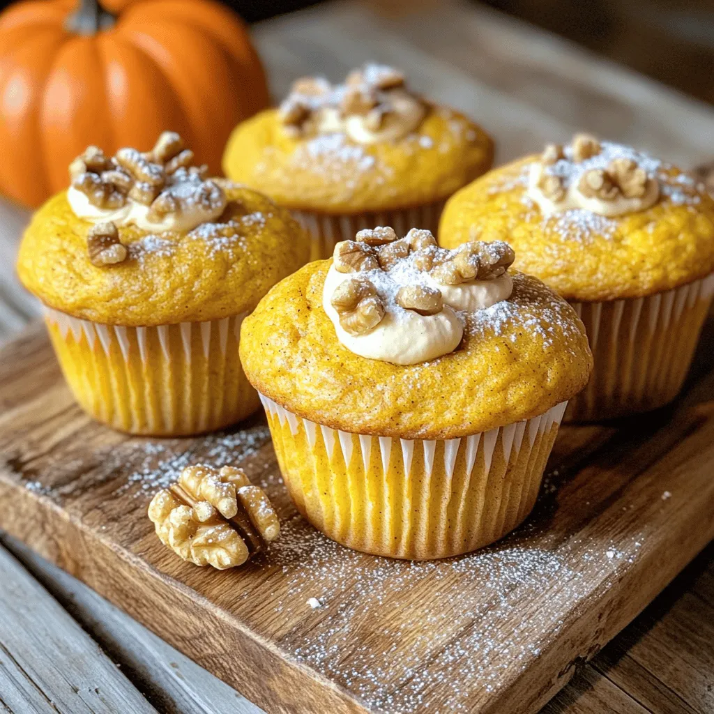 - 1 cup all-purpose flour - 1/2 cup whole wheat flour - 1 teaspoon baking powder - 1/2 teaspoon baking soda - 1/2 teaspoon salt - 1 teaspoon ground cinnamon - 1/2 teaspoon ground nutmeg - 1/4 teaspoon ground ginger - 1 cup canned pumpkin puree - 1/2 cup granulated sugar - 1/2 cup brown sugar - 1/3 cup vegetable oil - 2 large eggs - 1 teaspoon vanilla extract - 4 oz cream cheese, softened - 1 tablespoon honey - Chopped walnuts or pecans for topping These ingredients come together to make the best pumpkin cream cheese muffins. You will love how simple they are. The dry ingredients give structure, while the wet ones add moisture and flavor. I often use canned pumpkin puree. It saves time and tastes great. For more flavor, try adding honey to the cream cheese. It creates a sweet surprise in every bite. If you like crunch, add walnuts or pecans on top. It adds lovely texture and taste. Gather everything before you start. It makes the process smooth and fun. First, preheat your oven to 350°F (175°C). This step is key for even baking. Line your muffin tin with paper liners or spray it with cooking spray. This helps the muffins pop out easily after baking. In a large bowl, whisk together the following dry ingredients: - 1 cup all-purpose flour - 1/2 cup whole wheat flour - 1 teaspoon baking powder - 1/2 teaspoon baking soda - 1/2 teaspoon salt - 1 teaspoon ground cinnamon - 1/2 teaspoon ground nutmeg - 1/4 teaspoon ground ginger Make sure everything is well combined. This ensures that your muffins rise evenly and taste great. In another bowl, combine these wet ingredients: - 1 cup canned pumpkin puree - 1/2 cup granulated sugar - 1/2 cup brown sugar - 1/3 cup vegetable oil - 2 large eggs - 1 teaspoon vanilla extract Mix until the mixture is smooth. This helps blend the flavors together perfectly. Now, pour the wet mixture into the dry ingredients. Gently fold them together. Be careful not to overmix; a few lumps are just fine. Overmixing can make your muffins tough. In a small bowl, mix together: - 4 oz cream cheese, softened - 1 tablespoon honey (optional) Blend until smooth. This creamy filling will add a delightful surprise to each muffin. Spoon a tablespoon of muffin batter into each muffin cup. Add a dollop of the cream cheese mixture in the center. Then, cover it with another tablespoon of muffin batter. This layering creates a delicious cream cheese core. If you like, sprinkle a few chopped walnuts or pecans on top of each muffin. This adds extra crunch and flavor. The nuts also make the muffins look beautiful. Bake the muffins in the preheated oven for 20-25 minutes. Check if they are done by inserting a toothpick into the center. If it comes out clean, they are ready! Let them cool in the pan for 5 minutes before moving them to a wire rack. This helps them maintain their shape. To make great muffins, you must mix carefully. Overmixing can lead to tough muffins. When combining wet and dry ingredients, fold gently. Mix until just combined. A few lumps are okay. This keeps your muffins soft and fluffy. To create the best cream cheese filling, start with room temperature cream cheese. This makes it easier to mix. If you want added sweetness, mix in honey. Use a small scoop to place the filling in the center of the batter. Don’t worry if it looks messy. The cream cheese will spread while baking. Serving your muffins well makes them even more appealing. For a cozy display, use a wooden board. Place muffins in a neat row. Dust them with powdered sugar for a touch of sweetness. Add a small pumpkin or fall decoration nearby. This enhances the seasonal vibe and makes your muffins shine. {{image_2}} You can make a few easy swaps to boost nutrition. Use whole wheat flour instead of all-purpose flour. This adds fiber and nutrients. You might also try applesauce instead of oil. This cuts fat and adds moisture. If you want less sugar, reduce the granulated and brown sugar by half. For a vegan version, replace eggs with flaxseed or chia seeds mixed with water. Want to change the flavor? Add chocolate chips for a sweet twist. You can also mix in dried fruits like cranberries or raisins. These add sweetness and texture. For a nutty touch, fold in chopped walnuts or pecans. A pinch of cardamom or cloves can give your muffins a warm, spiced flavor. You can adjust the recipe with seasonal ingredients. In winter, consider adding cranberries or pears. For spring, try lemon zest for a fresh taste. During summer, swap pumpkin for ripe bananas or zucchini. This keeps your muffins exciting and fun all year round! You can store your pumpkin cream cheese muffins at room temperature. Place them in an airtight container. Keep them away from direct sunlight. They will stay fresh for up to three days. If you see any signs of mold, toss them out right away. Freezing muffins is a great way to save them for later. First, let them cool completely. Wrap each muffin in plastic wrap tightly. Then, place them in a freezer-safe bag or container. Label the bag with the date. You can freeze them for up to three months. When you’re ready to eat, just thaw them in the fridge overnight. Reheating pumpkin cream cheese muffins is easy and quick. You can use a microwave or an oven. For the microwave, heat one muffin for about 15-20 seconds. If you use the oven, preheat it to 350°F (175°C). Place the muffins on a baking sheet and heat for about 5-10 minutes. Enjoy them warm for the best flavor! Yes, you can make these muffins gluten-free. Use a gluten-free all-purpose flour blend instead of regular flour. Ensure the blend has a good mix of starches and proteins for the best results. You may need to adjust the baking time slightly, so keep an eye on them while they bake. If you want a substitute for cream cheese, try using ricotta or Greek yogurt. Both will add a creamy texture and mild flavor. You can also use vegan cream cheese if you prefer a dairy-free option. Each will change the taste slightly but still create a delicious m