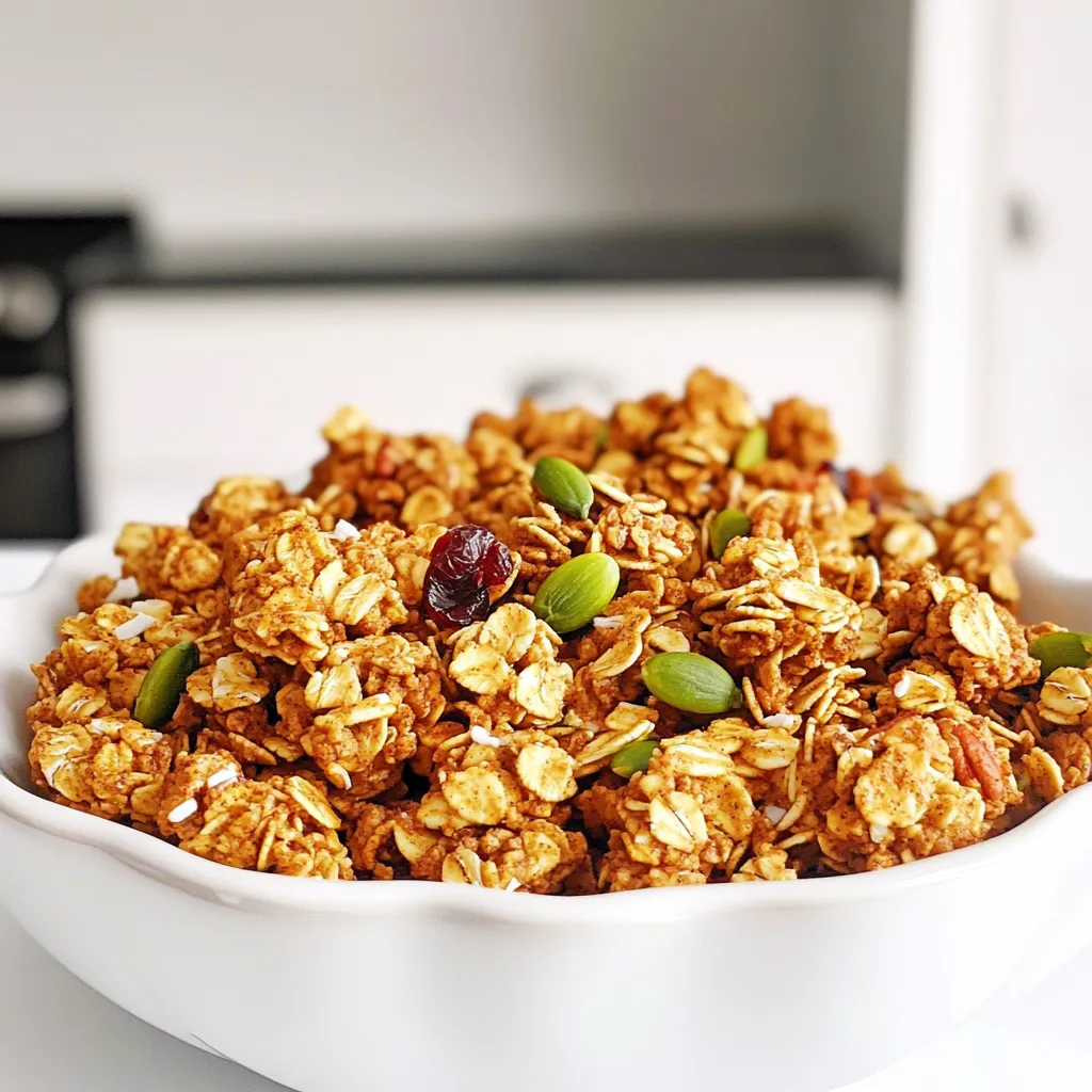 For our pumpkin spice granola clusters, you will need the following: - 3 cups rolled oats - 1 cup pumpkin seeds - 1/2 cup chopped pecans - 1/2 cup almond butter (or peanut butter) - 1/2 cup honey or maple syrup - 1 teaspoon vanilla extract - 2 teaspoons pumpkin pie spice - 1/2 teaspoon salt - 1/2 cup dried cranberries (optional) - 1/4 cup unsweetened coconut flakes (optional) You can add some fun extras to your granola. Here are a few ideas: - Chopped nuts like walnuts or almonds - Chocolate chips for a sweet touch - Seeds like sunflower or chia for extra nutrition - Other dried fruits like raisins or apricots If you don’t have something on hand, don’t worry! Here are some swaps: - Use sunflower seed butter instead of almond butter. - Substitute agave nectar for honey or maple syrup. - Replace pumpkin seeds with sunflower seeds if needed. - Use quick oats instead of rolled oats for a different texture. These ingredients work together to make a tasty and healthy snack. Feel free to mix and match to suit your taste! Start by greasing your slow cooker. Use a bit of coconut oil or cooking spray. This step helps prevent sticking. It makes removing the granola easier later. In a large bowl, mix the dry ingredients. Add 3 cups of rolled oats, 1 cup of pumpkin seeds, and 1/2 cup of chopped pecans. Then, stir in 2 teaspoons of pumpkin pie spice and 1/2 teaspoon of salt. Make sure everything is well mixed. This step ensures each bite is flavorful. In another bowl, whisk together 1/2 cup of almond butter and 1/2 cup of honey. You can also use maple syrup if you prefer. Add in 1 teaspoon of vanilla extract. Whisk until the mixture is smooth. This will add sweetness and depth to your granola. Pour the wet mixture over the dry ingredients. Use a spatula to mix everything together. Make sure all the oats and seeds are coated well. This helps the flavors blend perfectly. Transfer the mixture into the slow cooker. Spread it out evenly. Cover the cooker with the lid. Set it to low and cook for 2-3 hours. Stir the granola every 30 minutes. This keeps it cooking evenly. When it turns golden brown and smells great, it's done. Let it cool with the lid slightly open. This step helps it crisp up nicely. To make the best pumpkin spice granola clusters, you need to focus on the wet and dry mix. Make sure you mix the wet ingredients well. This helps the oats and seeds stick together. When you spread the mixture in the slow cooker, press it down gently. This helps form nice clusters. Stir every 30 minutes while cooking to ensure even heat. When it's golden brown, take it out to cool. The cooling step is key for great clusters. Let it sit with the lid ajar to let moisture escape. You can boost the flavor in your granola. Try adding a pinch of cinnamon or nutmeg for warmth. If you love a sweeter touch, add more honey or maple syrup. You can also mix in some chocolate chips after cooking. This makes a delicious treat! If you like fruit, toss in dried cranberries or apples for extra flavor. Coconut flakes add a nice crunch, too. Each of these adds a different layer of taste to your granola. To keep your granola fresh, store it in airtight containers. This helps keep it crunchy. It can last for up to two weeks on your kitchen shelf. If you want it to last longer, freeze it in small batches. Just thaw what you need when you want a snack. This way, your pumpkin spice granola clusters will always taste fresh and delicious! {{image_2}} If you need a nut-free version of pumpkin spice granola clusters, you can swap out pecans. Use sunflower seeds or pumpkin seeds only. These seeds add great crunch and flavor. You can also add some extra oats to replace the nut volume. This keeps the texture light and tasty without nuts. You have many sweetener choices for this recipe. Honey is a popular choice, but maple syrup works just as well. If you prefer a lower-calorie option, try agave syrup or coconut sugar. Both give a sweet touch without overpowering the pumpkin spice flavor. Adjust the amount to fit your taste. Make your granola special by adding seasonal ingredients. In fall, mix in chopped apples or pears for fresh flavor. In winter, dried figs or dates add natural sweetness. Even a bit of grated ginger can spice up your mix. These add-ins keep your granola exciting and fun throughout the year. To keep your pumpkin spice granola fresh, use airtight containers. Glass jars or plastic bins work well. Avoid leaving them in open bags. Store the granola in a cool, dry place. This will help maintain its crunch and flavor. You can freeze granola too! Just place it in freezer-safe bags. Remove as much air as possible before sealing. Label the bags with the date. When you want to eat it, let it thaw in the fridge overnight. When stored properly, your granola can last about two weeks. If you freeze it, it can stay fresh for up to three months. Always check for any signs of spoilage before enjoying. This way, you can savor your delicious pumpkin spice granola clusters longer! Yes, you can use quick oats. However, quick oats may make your granola less chunky. They cook faster and absorb moisture differently. For best results, stick to rolled oats for nice, big clusters. To make this recipe vegan, substitute honey with maple syrup. Use the same amount, and your granola will still taste great. Almond butter is vegan too, so you are all set there! If you don't have almond butter, try peanut butter or sunflower seed butter. These options work well too. They add flavor and help bind the granola together. Yes, you can! Spread the mixture on a baking sheet. Bake at 300°F for about 25-30 minutes. Stir halfway through. This method gives you a crispy texture and great flavor. To make crunchy granola, cook it longer in the slow cooker. Let it cool with the lid slightly open. This step helps it crisp up nicely. You can also add a bit more almond butter or sweetener for extra crunch. This blog post covered how to make tasty granola step by step. We 