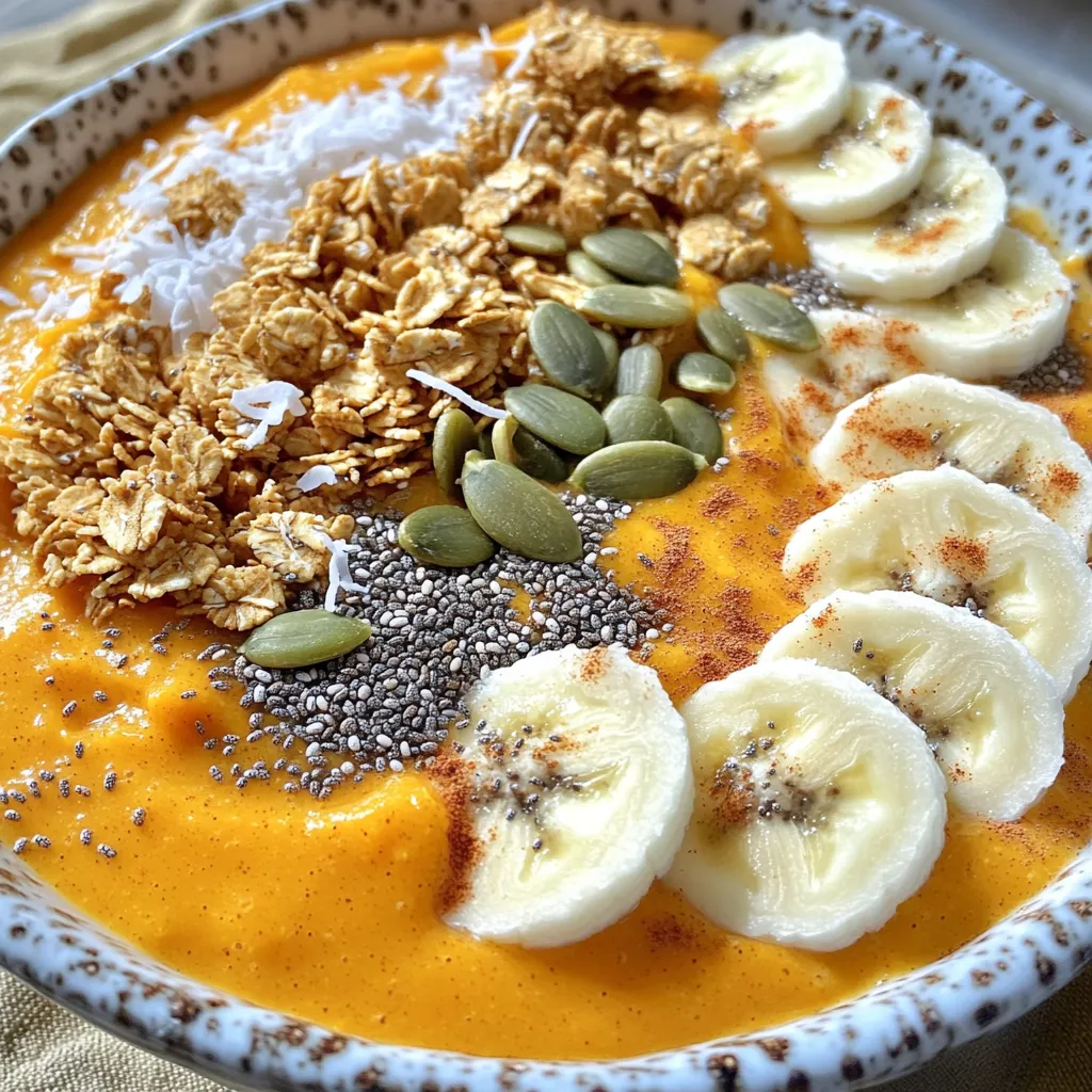 Pour your smoothie into a bowl carefully. Use a spoon to create a smooth, even surface. Now comes the fun part—toppings! You can add granola, sliced bananas, chia seeds, pumpkin seeds, and shredded coconut. Don’t forget to sprinkle a bit of pumpkin spice on top for an extra touch. Enjoy your beautiful pumpkin spice smoothie bowl!