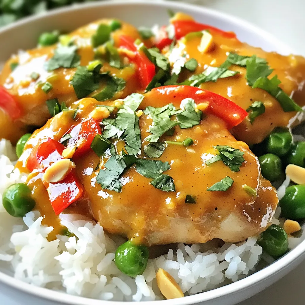 To make Quick and Delicious Thai Peanut Chicken, gather these fresh and simple ingredients. - Chicken Thighs - 1 lb (450g) boneless, skinless chicken thighs, sliced into strips - Peanut Sauce Components - 1/2 cup creamy peanut butter - 1/4 cup soy sauce - 2 tablespoons honey - 1 tablespoon fresh lime juice - 1 tablespoon sesame oil - 1 teaspoon minced garlic - 1 teaspoon grated ginger - Vegetables and Garnishes - 1 red bell pepper, sliced - 1 cup snap peas, trimmed - 1/4 cup chopped fresh cilantro (for garnish) - 1/4 cup chopped peanuts (for garnish) - Cooked jasmine rice or rice noodles (for serving) These ingredients blend together to create a rich and tasty dish. The chicken thighs provide a juicy base. The peanut sauce adds a creamy texture, while the veggies give a fresh crunch. All these flavors make this meal a hit for any dinner. {{ingredient_image_1}} To make the peanut sauce, grab a mixing bowl. Add 1/2 cup of creamy peanut butter. Then, pour in 1/4 cup of soy sauce. Next, add 2 tablespoons of honey for sweetness. Squeeze in 1 tablespoon of fresh lime juice. Drizzle in 1 tablespoon of sesame oil. Finally, mix in 1 teaspoon of minced garlic and 1 teaspoon of grated ginger. Whisk everything together until smooth. This sauce will give your dish a rich flavor. Next, take a large skillet or wok. Heat it over medium-high heat. Add a splash of oil to the pan. Once hot, add the sliced chicken thighs. Cook them for about 5 to 7 minutes. You want them golden brown and cooked through. This step is key to getting juicy chicken. After the chicken is cooked, it's time to add the veggies. Toss in the sliced red bell pepper and snap peas. Stir-fry for 3 to 4 minutes. You want the veggies to be tender yet crisp. Now, pour the peanut sauce over the chicken and vegetables. Toss everything together until well-coated. Allow it to cook for another 2 minutes. This heats everything through. Taste your dish and adjust the flavor if needed. Add more soy sauce or lime juice if desired. Serve the Thai peanut chicken hot over cooked jasmine rice or rice noodles. Garnish with chopped fresh cilantro and peanuts for a nice touch. Enjoy your meal! For juicy chicken, always use boneless, skinless thighs. They cook fast and stay moist. Cut the chicken into even strips. This helps them cook at the same rate. Heat your skillet before adding oil. A hot pan sears the chicken, locking in flavor. Cook the chicken until it's golden brown. This usually takes about 5 to 7 minutes. Don't overcrowd the pan; this can steam the chicken instead of sear it. If needed, cook in batches for the best results. The peanut sauce is the star of this dish. To make it pop, use fresh ingredients. Fresh lime juice adds a bright taste. Consider adding a pinch of red pepper flakes for heat. You can also mix in a bit of coconut milk for creaminess. Taste the sauce before adding it to the chicken. This lets you adjust the flavor to your liking. If it’s too thick, a splash of water can help. Make sure to stir it well to combine all flavors. Serve the Thai peanut chicken over jasmine rice or rice noodles. Both options soak up the sauce well. Add extra veggies for color and crunch. Consider using steamed broccoli or carrots as great additions. Garnish with fresh cilantro and chopped peanuts for a nice touch. If you want more flavor, squeeze extra lime on top. This dish pairs well with a light salad or steamed greens. Enjoy with a cold drink to balance the flavors. Pro Tips Use Fresh Ingredients: Fresh vegetables and herbs can enhance the flavor and texture of your dish significantly. Adjust the Spice Level: If you prefer a spicier dish, consider adding red pepper flakes or a dash of Sriracha to the peanut sauce. Meal Prep Friendly: This dish can be prepared in advance and stored in the fridge for up to 3 days, making it great for meal prep. Experiment with Proteins: Feel free to substitute chicken with tofu, shrimp, or beef for a different protein option. {{image_2}} You can change the protein in this Thai peanut chicken. If you want to use chicken breast, it will work well. Just cook it for the same time as thighs. You can also use shrimp or tofu. Cook shrimp for about 3-5 minutes until pink. If you pick tofu, press it first to remove water. Then, cube and cook until golden brown. If you want a vegetarian dish, try replacing chicken with vegetables or tofu. Use more veggies like bell peppers, broccoli, or carrots. For protein, add firm tofu or tempeh. Cook them until crispy. The peanut sauce will still add great flavor to your meal. To make this dish gluten-free, swap soy sauce for tamari. Tamari tastes like soy sauce but does not have gluten. Check your peanut butter too. Some brands add fillers that may contain gluten. Serve the dish with rice or gluten-free noodles for a complete meal. Store any leftover Thai peanut chicken in an airtight container. Make sure it cools down first. Place it in the fridge. It stays fresh for up to 4 days. Always check for freshness before eating. To reheat, use a skillet over low heat. Add a splash of water to keep it moist. Stir it often until it's hot. You can also use a microwave. Heat it in short bursts, stirring in between. You can freeze Thai peanut chicken for later. Use a freezer-safe container. It keeps well for about 2-3 months. Thaw it in the fridge overnight before reheating. This helps it taste great again! Yes, you can use chicken breast. Chicken breast is leaner than thighs. This change may make the dish a bit drier, so be careful not to overcook it. Thighs have more fat, which adds flavor. If you use breasts, try marinating them in the peanut sauce for extra moisture. If you need a substitute for peanut butter, try almond butter or sunflower seed butter. Both options work well in this dish. They add a similar creamy texture. You can also use tahini, which is made from sesame seeds. This option gives a nutty flavor that fits the dish. To make the dish less spicy, reduce the amount of garlic and