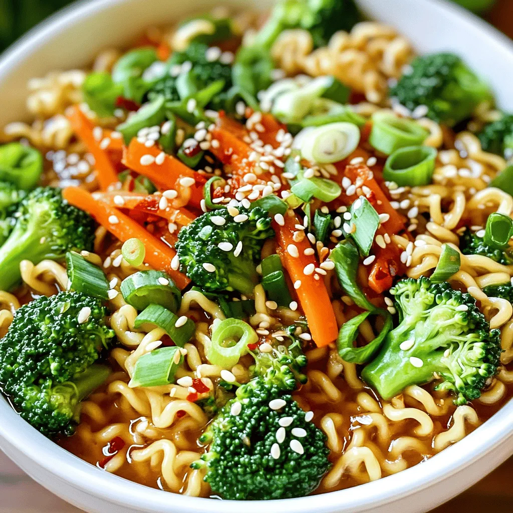 Once the veggies are ready, add 2 packs of instant ramen noodles. Discard the seasoning packets, as we have our own tasty mix! Cook the noodles according to the package instructions, usually about 3 to 4 minutes. Stir occasionally to break them apart. When the noodles are soft, take the pot off the heat. Taste your broth and adjust if needed. You can add more soy sauce or chili flakes for extra kick. Finally, ladle the ramen into bowls and top with sliced green onions and sesame seeds. Enjoy your wholesome and tasty meal!