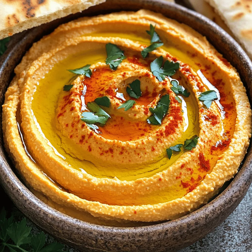 To make this tasty dip, you need a few main ingredients: - 1 cup canned chickpeas, drained and rinsed - 1 large roasted red pepper (you can use jarred or homemade) - 2 tablespoons tahini - 2 cloves garlic, minced - 2 tablespoons olive oil - 2 tablespoons lemon juice - 1/2 teaspoon cumin - Salt to taste To make the hummus even better, consider these extras: - Water, as needed for the right texture - Fresh parsley, for garnish - Paprika, for garnish You will need some simple tools to make this dip: - A food processor for blending - A baking sheet if you're roasting peppers - A bowl for mixing and steaming peppers With these ingredients and tools in hand, you can create a delightful roasted red pepper hummus that everyone will love! To make roasted red peppers, start by preheating your oven to 450°F (230°C). Cut a large bell pepper in half and remove the seeds. Place the halves on a baking sheet, skin side up. Roast them for about 25-30 minutes until the skin is charred and black. This roasting brings out sweet flavors. Once done, place the peppers in a bowl and cover it with plastic wrap for 10 minutes. This steaming helps loosen the skin. After they cool, peel off the charred skin. Now, your peppers are ready for the hummus! In a food processor, add one cup of drained chickpeas, your roasted red pepper, 2 tablespoons of tahini, and 2 cloves of minced garlic. Next, pour in 2 tablespoons of olive oil and 2 tablespoons of lemon juice. Add 1/2 teaspoon of cumin for a warm flavor. Blend all these ingredients on high speed until smooth. You may need to scrape down the sides of the bowl to ensure everything mixes well. This process allows all the flavors to blend nicely. If your hummus is too thick, don’t worry! Gradually add cold water, one tablespoon at a time. Blend after each addition until you reach your desired creaminess. Taste your hummus and adjust the seasoning with salt or more lemon juice if needed. Once it’s smooth and creamy, transfer the hummus to a serving bowl. For the final touch, drizzle some olive oil on top, sprinkle paprika, and add fresh parsley for a lovely garnish. Enjoy your homemade roasted red pepper hummus! You can change the flavor of your hummus easily. Try adding roasted garlic for a sweeter taste. For a kick, mix in a bit of cayenne pepper or red pepper flakes. You can also add herbs like basil or cilantro for a fresh twist. If you love a nutty flavor, consider using almond butter instead of tahini. One mistake is not draining the chickpeas well. This can make your hummus too watery. Another issue is not blending long enough. A smooth hummus needs time to blend, so be patient. Also, remember to taste it! You might need more salt or lemon juice for that perfect balance. To make your hummus look great, use a shallow bowl. Spread the hummus out in the bowl and create a small well in the center. Drizzle olive oil into the well and add a sprinkle of paprika. Finally, add fresh parsley on top for color. This simple trick makes your dip more inviting! {{image_2}} Roasted red pepper hummus pairs well with many tasty foods. Here are some of my favorites: - Pita Bread: Soft pita is perfect for scooping. - Veggies: Carrots, cucumbers, and bell peppers add crunch. - Crackers: Choose your favorite type for a fun texture. - Spread on Sandwiches: Use it to add flavor to wraps or subs. You can serve hummus in fun and unique ways. Try these ideas: - Hummus Platter: Create a colorful platter with dips and veggies. - Stuffed Peppers: Fill mini bell peppers with hummus for a bite-sized treat. - Hummus Toast: Spread on whole-grain bread and top with sliced tomatoes. - Hummus Dip Cups: Serve in small cups with assorted dippers for easy snacking. Adjust your serving ideas based on the season. Here are some suggestions: - Summer: Serve with fresh, grilled vegetables for a light meal. - Fall: Pair with roasted root veggies for a warm touch. - Winter: Add to a cozy soup for extra creaminess and flavor. - Spring: Use it as a dressing for vegetable salads with fresh herbs. Each serving of roasted red pepper hummus has about 150 calories. You get 6 grams of protein and 8 grams of fat. This dip also has 14 grams of carbs and 4 grams of fiber. These numbers can vary based on how much olive oil you add or if you use less salt. - Chickpeas: These provide protein and fiber. They help keep you full and aid digestion. - Roasted Red Peppers: Packed with vitamins A and C, they support your immune system. Their bright color adds antioxidants, which fight free radicals. - Tahini: This sesame seed paste is rich in healthy fats and calcium. It also boosts the flavor while adding creaminess. - Garlic: Known for its strong taste, garlic may help lower blood pressure and improve heart health. - Olive Oil: This oil has heart-healthy fats and can reduce inflammation. It also adds a rich flavor to the dip. Roasted red pepper hummus is great for many diets. With only 150 calories per serving, it fits well into a healthy eating plan. If you watch carbs, the 14 grams per serving can suit low-carb diets too. You can also control calories by adjusting olive oil or serving size. This dip is perfect for snacking or as a side dish. Choose fresh veggies or whole-grain pita for dipping to make it even healthier! Yes, you can make hummus without tahini. You can use extra olive oil or nut butter instead. Both options add creaminess and flavor. If you skip tahini, the hummus will taste different. It may lose some depth, but it will still be tasty. You can also add more roasted red pepper for extra flavor. Homemade hummus stays fresh for about five to seven days in the fridge. Make sure to store it in an airtight container. If you see any signs of spoilage, like mold or an off smell, throw it away. To keep it fresh, always use clean utensils when scooping. This keeps bacteria out of your hummus. Yes, you can freeze Roasted Red Pepper Hummus. It freezes well for about three months. Use an airtight container or a freeze