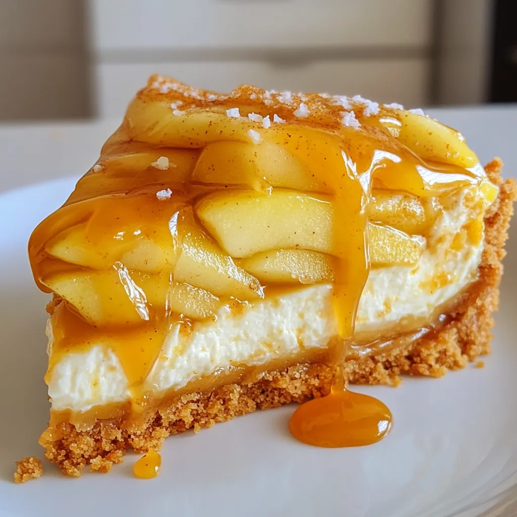 - 1 ½ cups graham cracker crumbs - ½ cup unsalted butter, melted - ¼ cup granulated sugar - 16 oz cream cheese, softened - 1 cup granulated sugar - 1 teaspoon vanilla extract - 3 large eggs - 1 teaspoon ground cinnamon - 3 medium apples (Granny Smith recommended) - 2 tablespoons brown sugar - 1 teaspoon ground cinnamon - 1 tablespoon lemon juice - 1 cup granulated sugar - 6 tablespoons unsalted butter - ½ cup heavy cream - 1 teaspoon sea salt Gathering fresh ingredients is key to a great cheesecake. Start with the crust. Use graham cracker crumbs for a nice crunch. Melt unsalted butter to bind everything together. Add sugar to sweeten the crust. Next, let's talk about the cheesecake layer. Softened cream cheese gives a smooth texture. You need granulated sugar for sweetness and vanilla for flavor. Eggs add richness, and cinnamon brings warmth. For the apple filling, I suggest Granny Smith apples. They’re tart and hold up well. Mix them with brown sugar and cinnamon for flavor. Lemon juice enhances their taste and prevents browning. Finally, the salted caramel sauce is a star. Melt granulated sugar until it turns golden. Add butter and cream slowly, then stir in sea salt. This sauce adds a salty-sweet twist that ties everything together. Gather these ingredients, and you’re ready to create a delightful dessert! {{ingredient_image_1}} - Preheat your oven to 350°F (175°C). - In a bowl, mix 1 ½ cups graham cracker crumbs, ½ cup melted butter, and ¼ cup sugar until well combined. - Press this mixture firmly into the bottom of a 9-inch springform pan. - Bake for 8-10 minutes until golden. Let it cool completely. - Slice 3 medium apples thinly and place them in a bowl. - Add 2 tablespoons brown sugar, 1 teaspoon ground cinnamon, and 1 tablespoon lemon juice. - Toss the apples until well coated. Let them sit to soften for about 10 minutes. - In a large bowl, beat 16 oz softened cream cheese until smooth. - Gradually add 1 cup granulated sugar and 1 teaspoon vanilla extract, mixing until well combined. - Add 3 large eggs, one at a time, mixing on low speed after each addition. - Stir in 1 teaspoon ground cinnamon until fully blended. - Pour half of the cheesecake batter over the cooled crust. - Evenly layer the apple filling over the cheesecake batter. - Pour the remaining cheesecake batter on top of the apples, smoothing it out. - Bake in the preheated oven for 50-60 minutes. - Look for the edges to be set, while the center remains slightly jiggly. - Turn off the oven and let the cheesecake cool inside for an hour with the door slightly ajar. - In a saucepan over medium heat, melt 1 cup granulated sugar, stirring constantly. - Once it turns a golden amber color, add 6 tablespoons unsalted butter and stir well. - Gradually pour in ½ cup heavy cream, stirring continuously until smooth. - Remove from heat, stir in 1 teaspoon sea salt, and let it cool slightly. - After the cheesecake has cooled, refrigerate it for at least 4 hours, or overnight for the best texture. To keep your cheesecake smooth, follow these tips: - Use room temperature ingredients. This helps blend all the items well. - Mix gently. Over-mixing can add air, causing cracks during baking. - Bake in a water bath. Place your pan in a larger one filled with water. This keeps the heat steady. - Cool slowly. After baking, turn off the oven and leave the door slightly open. This helps the cheesecake cool without shocking it. Choosing the right apples makes a big difference. For this recipe, I love using Granny Smith apples. They are tart, crisp, and hold their shape well. To caramelize apples: - Slice them thin. This allows even cooking and flavor absorption. - Sauté with sugar and cinnamon. Cook them over medium heat until soft and golden. This enhances their natural sweetness. Presentation makes your cheesecake shine. Here are some ideas: - Drizzle extra caramel sauce. It adds flair and flavor. - Garnish with chopped nuts. They give a nice crunch. - Pair with drinks. Enjoy with coffee or a sweet dessert wine. This adds a lovely touch to your meal. - Apple slices on the side. They look pretty and add freshness to each bite. Pro Tips Use Room Temperature Ingredients: Make sure your cream cheese and eggs are at room temperature before mixing. This ensures a smoother batter and prevents lumps. Don’t Overmix: When adding the eggs to the cheesecake batter, mix just until incorporated. Overmixing can introduce too much air and cause cracks during baking. Cool Gradually: After baking, allow the cheesecake to cool slowly in the oven with the door ajar. This reduces the risk of cracking and keeps the texture creamy. Chill Overnight: For the best flavor and texture, let the cheesecake chill in the refrigerator overnight before serving. This allows the flavors to meld beautifully. {{image_2}} You can switch up the taste of your cheesecake. Try adding spices like nutmeg or cloves. These spices add warmth and depth. You can also mix in fruit fillings. Pears or berries work well with apples. Experimenting with flavors makes each pie unique. If you need a gluten-free pie, you can change the crust. Use almond flour or gluten-free crumbs instead of graham crackers. For the cheesecake, try using gluten-free cream cheese. You can find many brands that are safe for gluten-free diets. To make a vegan version, swap cream cheese for a plant-based option. Use cashew cream or coconut cream instead. You can also replace eggs with flaxseed meal mixed with water. For a no-bake version, just skip the oven and chill it in the fridge. This way, you can still enjoy a creamy treat without any dairy. To keep your salted caramel apple pie cheesecake fresh, store it in the fridge. Place it in an airtight container or cover it with plastic wrap. This helps keep it moist and tasty. Try to eat it within five days for the best flavor. If you want to freeze leftovers, wrap them well. Use plastic wrap first, then cover with aluminum foil. This stops freezer burn