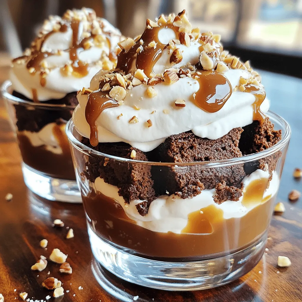 Use clear glass cups or jars for a pretty presentation. Start by adding a layer of brownie cubes at the bottom. Next, drizzle some caramel sauce over the brownies. Then, add a layer of whipped cream. Follow this with a layer of chocolate ganache. Repeat these layers until the glass is full. Finish with a layer of whipped cream on top for a beautiful look.